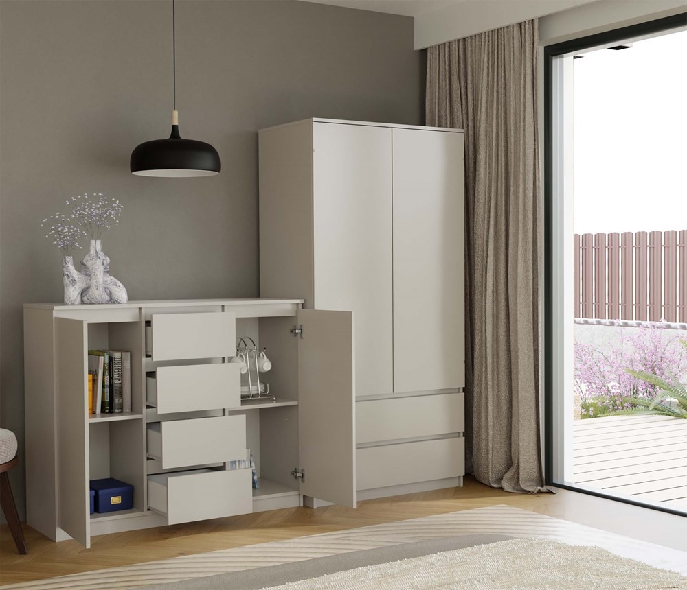 Komoda Malwa 2D4S kaszmir to nowoczesny i przestronny mebel, który doskonale odnajdzie się w salonie, sypialni lub pokoju dziecka. Jej elegancki design i modny odcień kaszmir wprowadzają do wnętrza subtelną elegancję i ciepło, harmonizując zarówno z nowoczesnymi, jak i klasycznymi aranżacjami. Dzięki przemyślanemu układowi z dwiema szafkami i czterema pojemnymi szufladami komoda zapewnia wygodne przechowywanie i porządek w każdej przestrzeni.