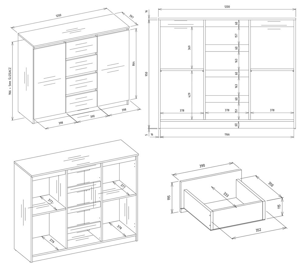 - Praktyczne wnętrze - cztery pojemne szuflady i dwie szafki z półkami ułatwiają przechowywanie odzieży, akcesoriów i dokumentów.