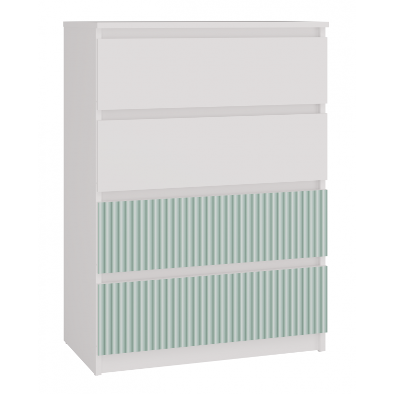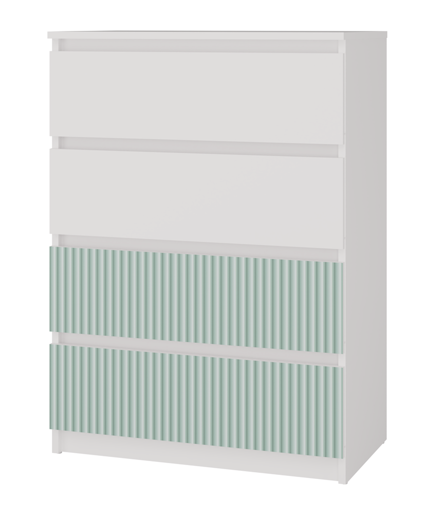 Nowoczesna komoda Malwa M4 Arteso w kolorze biało-miętowym to praktyczny i stylowy mebel, który wprowadzi do pokoju dziecka lub nastolatka świeży i pogodny akcent. Jej minimalistyczna bryła w bieli została uzupełniona subtelnym, miętowym nadrukiem na dwóch z czterech szuflad, co dodaje wnętrzu lekkości i nowoczesnego charakteru. Cztery pojemne szuflady pomieszczą wszystko, co potrzebne w dziecięcej przestrzeni, a bezuchwytowe fronty zapewniają wygodę i elegancki wygląd.