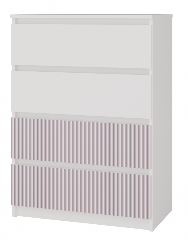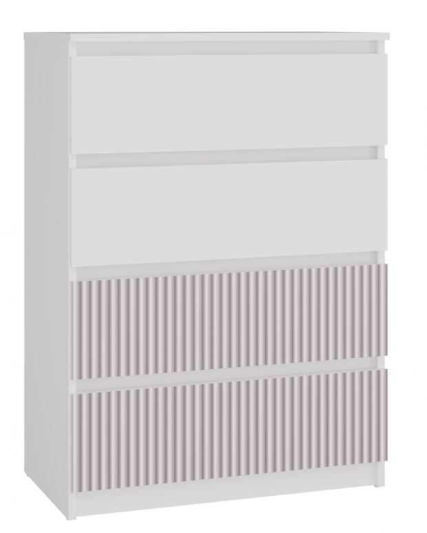 Nowoczesna komoda Malwa M4 Arteso w kolorze biało-różowym to elegancki i praktyczny mebel, który idealnie sprawdzi się w pokoju dziecka lub nastolatki. Prosta forma w bieli została urozmaicona subtelnym, różowym nadrukiem na dwóch z czterech szuflad, dzięki czemu całość prezentuje się lekko i przytulnie. Cztery pojemne szuflady zapewniają dużo miejsca do przechowywania, a bezuchwytowe fronty nadają komodzie nowoczesny charakter i wygodę użytkowania.