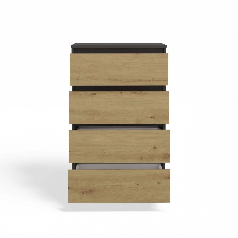 Nowoczesna komoda Malwa M4 w kolorze antracyt z frontami w dekorze dąb artisan to elegancki i pojemny mebel, który doskonale sprawdzi się w sypialni, salonie lub pokoju dziecka. Jej minimalistyczna bryła oraz modne zestawienie ciemnej podstawy z ciepłym odcieniem drewna nadają wnętrzu wyrazisty, a zarazem przytulny charakter. Cztery przestronne szuflady umożliwiają wygodne przechowywanie, a bezuchwytowe fronty podkreślają nowoczesny styl mebla.