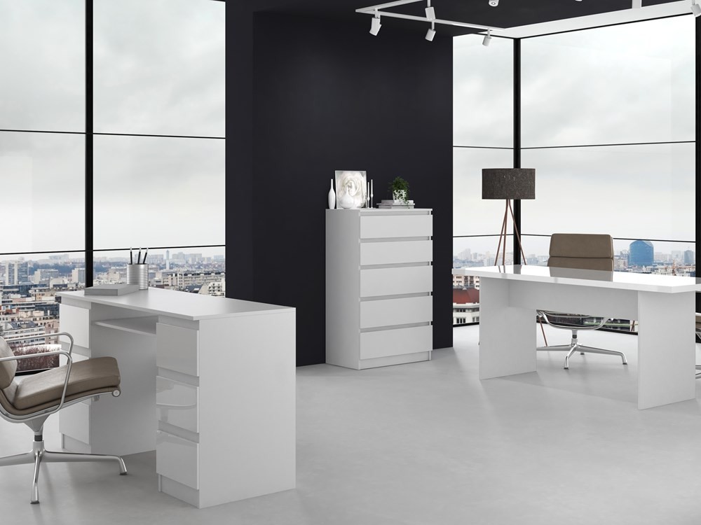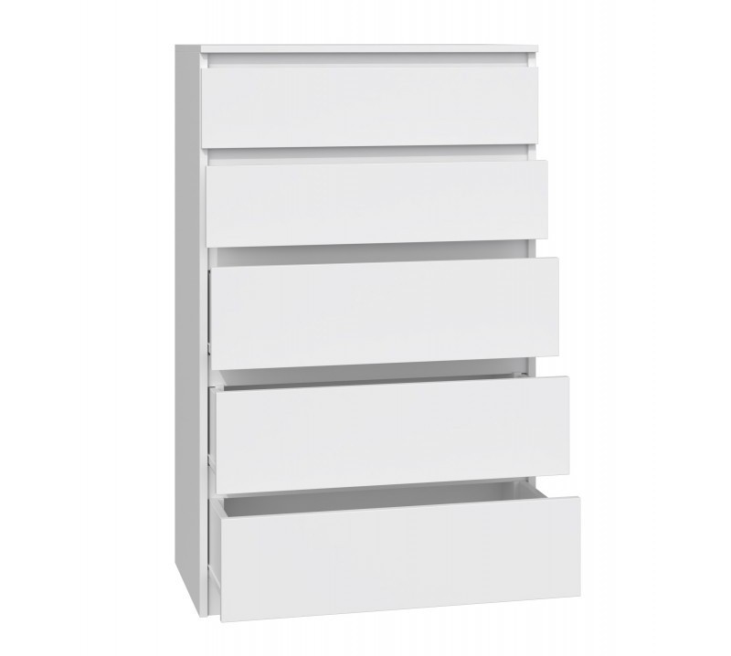 Nowoczesna komoda Malwa M5 w kolorze białym matowym to elegancki i ponadczasowy mebel, który znakomicie sprawdzi się w sypialni, salonie lub pokoju dziecka. Jej prosta, minimalistyczna forma i uniwersalna biel wprowadzają do wnętrza harmonię, optycznie je rozjaśniając i dodając mu lekkości. Pięć pojemnych szuflad zapewnia dużą przestrzeń do przechowywania, a bezuchwytowe fronty podkreślają nowoczesny i schludny charakter mebla.