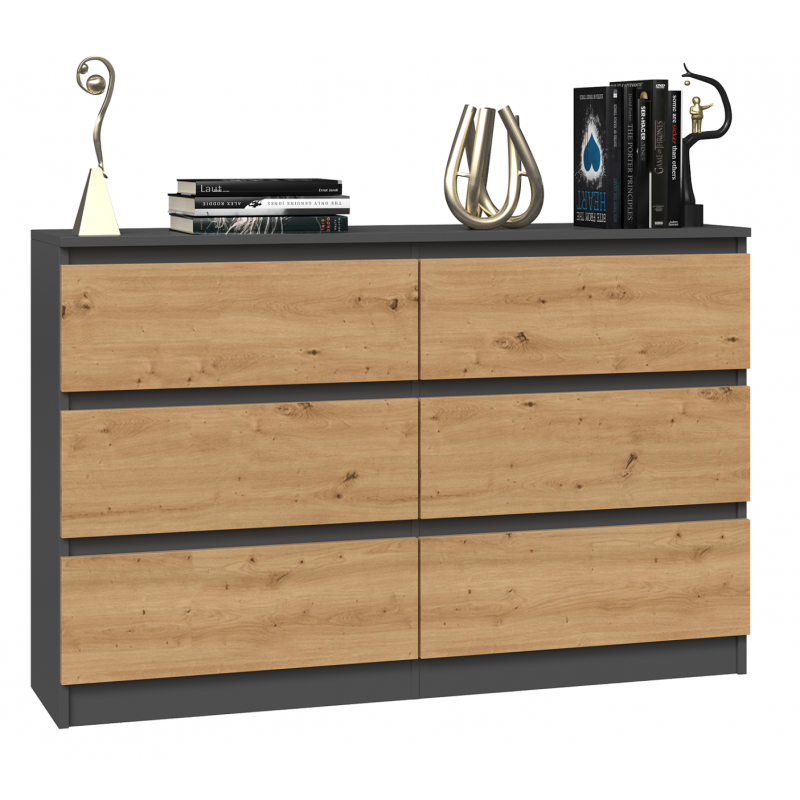 Nowoczesna komoda Malwa M6 120 w kolorze antracyt z frontami w dekorze dąb artisan to elegancki i praktyczny mebel, który doskonale sprawdzi się w sypialni, salonie lub pokoju dziecka. Jej minimalistyczna bryła i modne zestawienie kolorów – ciemnego korpusu i ciepłych, drewnianych frontów – tworzą stylowy akcent, pasujący zarówno do nowoczesnych, jak i klasycznych aranżacji. Sześć pojemnych szuflad zapewnia dużą ilość miejsca do przechowywania, a bezuchwytowe fronty podkreślają modernistyczny charakter mebla i wygodę użytkowania.