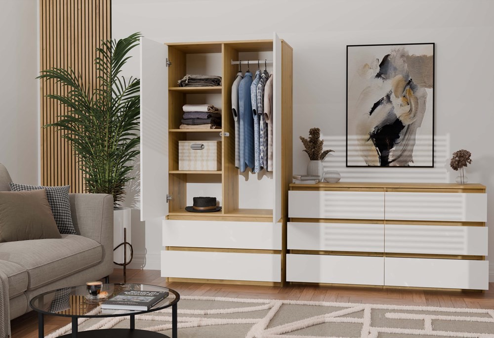 Nowoczesna komoda Malwa M6 120 w kolorze dąb artisan z białymi frontami to przestronny i elegancki mebel, który doskonale odnajdzie się w sypialni, salonie, gabinecie czy pokoju dziecka. Jej funkcjonalna konstrukcja z sześcioma pojemnymi szufladami pozwala wygodnie uporządkować ubrania, dokumenty lub akcesoria. Ciepły odcień drewna korpusu w połączeniu z białymi, minimalistycznymi frontami nadaje komodzie świeży i ponadczasowy wygląd, który świetnie komponuje się zarówno ze skandynawskimi, jak i klasycznymi aranżacjami.