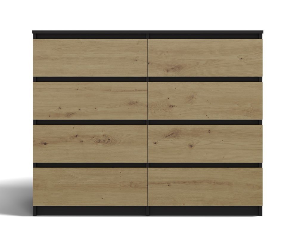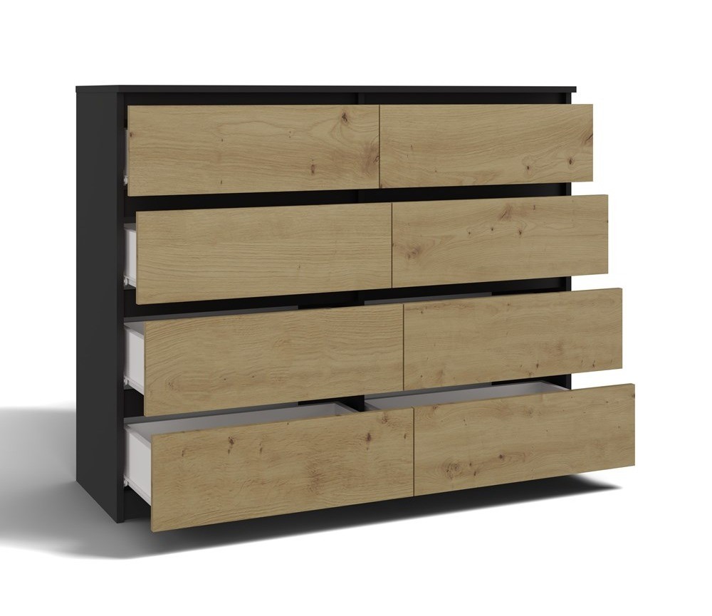 Nowoczesna komoda Malwa M8 120 w kolorze antracyt z frontami w dekorze dąb artisan to przestronny i elegancki mebel, który doskonale sprawdzi się w sypialni, salonie lub pokoju dziecka. Jej minimalistyczna forma oraz modne zestawienie ciemnego korpusu z ciepłymi, drewnianymi frontami nadają wnętrzu nowoczesny charakter i przytulność. Dzięki aż ośmiu pojemnym szufladom komoda umożliwia wygodne przechowywanie, a bezuchwytowe fronty podkreślają prostotę i elegancję bryły.