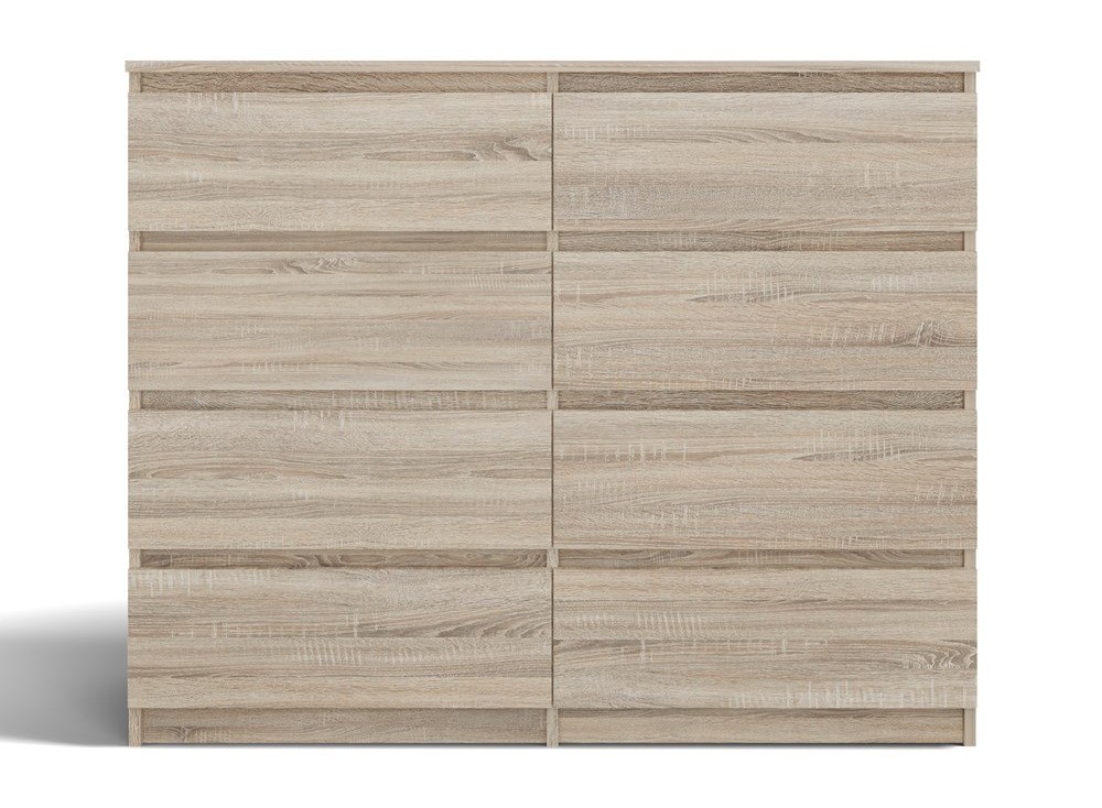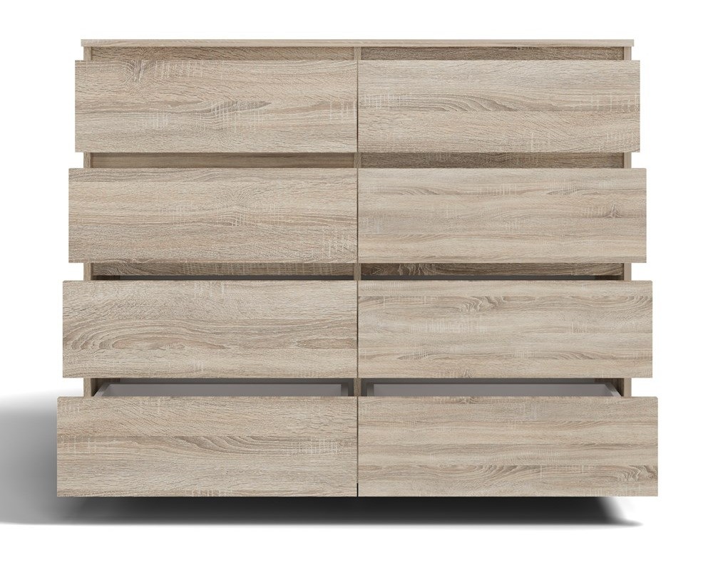 Nowoczesna komoda Malwa M8 120 w kolorze dąb sonoma to elegancki i praktyczny mebel, który doskonale odnajdzie się w sypialni, salonie lub pokoju dziecka. Jej minimalistyczna forma oraz ciepły, naturalny odcień drewna nadają wnętrzu przytulny i harmonijny charakter. Aż osiem pojemnych szuflad zapewnia dużą przestrzeń do przechowywania, a bezuchwytowe fronty podkreślają nowoczesny design i wygodę użytkowania.