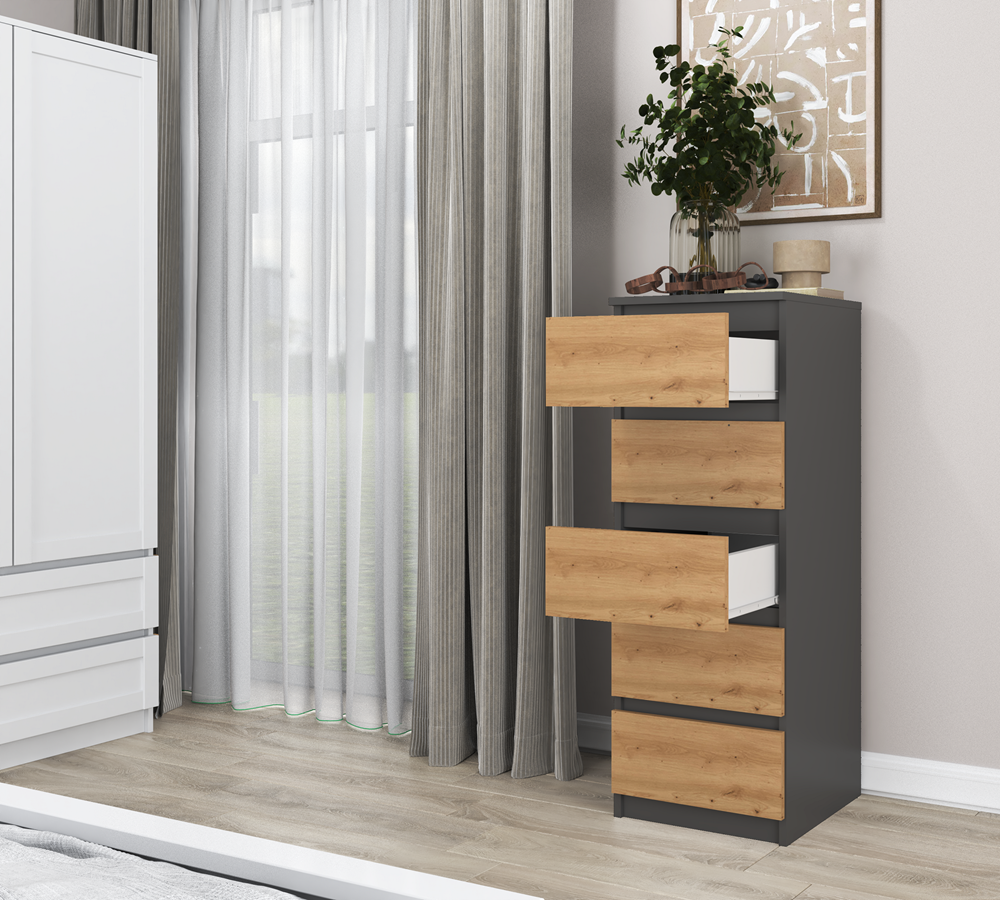 Nowoczesna komoda Malwa W5 w kolorze antracyt z frontami w dekorze dąb artisan to elegancki i praktyczny mebel, który idealnie sprawdzi się w sypialni, przedpokoju, pokoju dziecka czy gabinecie. Jej smukła, wysoka bryła pozwala maksymalnie wykorzystać przestrzeń, oferując dużą pojemność, a jednocześnie zajmuje niewiele miejsca. Pięć pojemnych szuflad z bezuchwytowymi frontami oraz płynnie działające prowadnice z blokadą podkreślają funkcjonalność i nowoczesny charakter mebla.