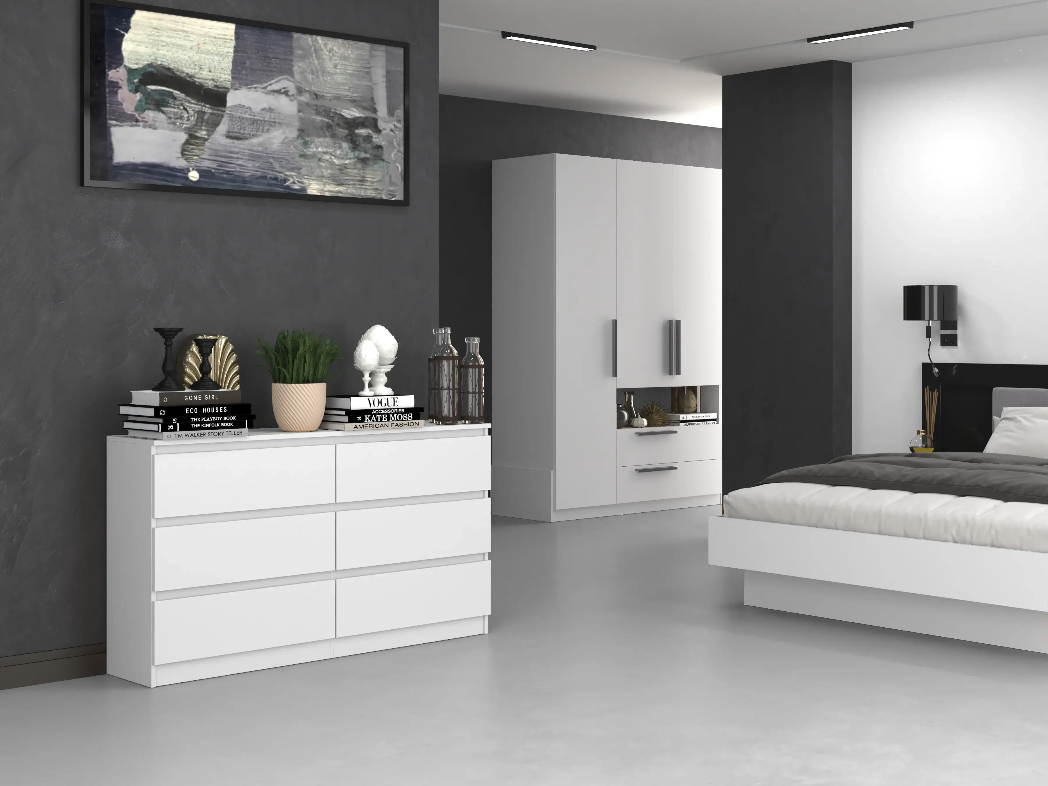 - Bezuchwytowe, fronty szuflad zapewniają wygodne użytkowanie i podkreślą modernistyczny charakter wnętrza.