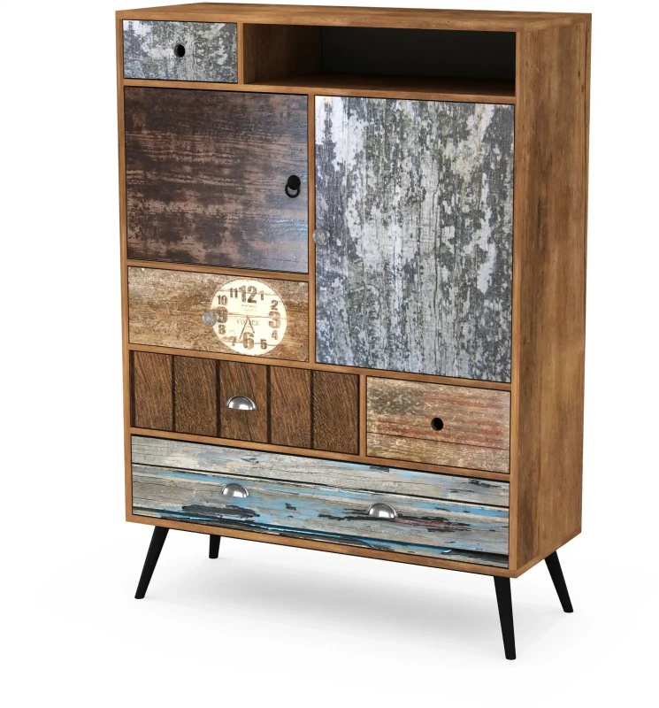 - Wyjątkowy design - każdy element komody został starannie zaprojektowany, aby stworzyć mebel, który przyciąga uwagę i dodaje wnętrzu unikalnego charakteru. Połączenie kolorów oraz różnorodnych tekstur frontów szuflad i drzwiczek nadaje komodzie artystycznego, niepowtarzalnego wyglądu.