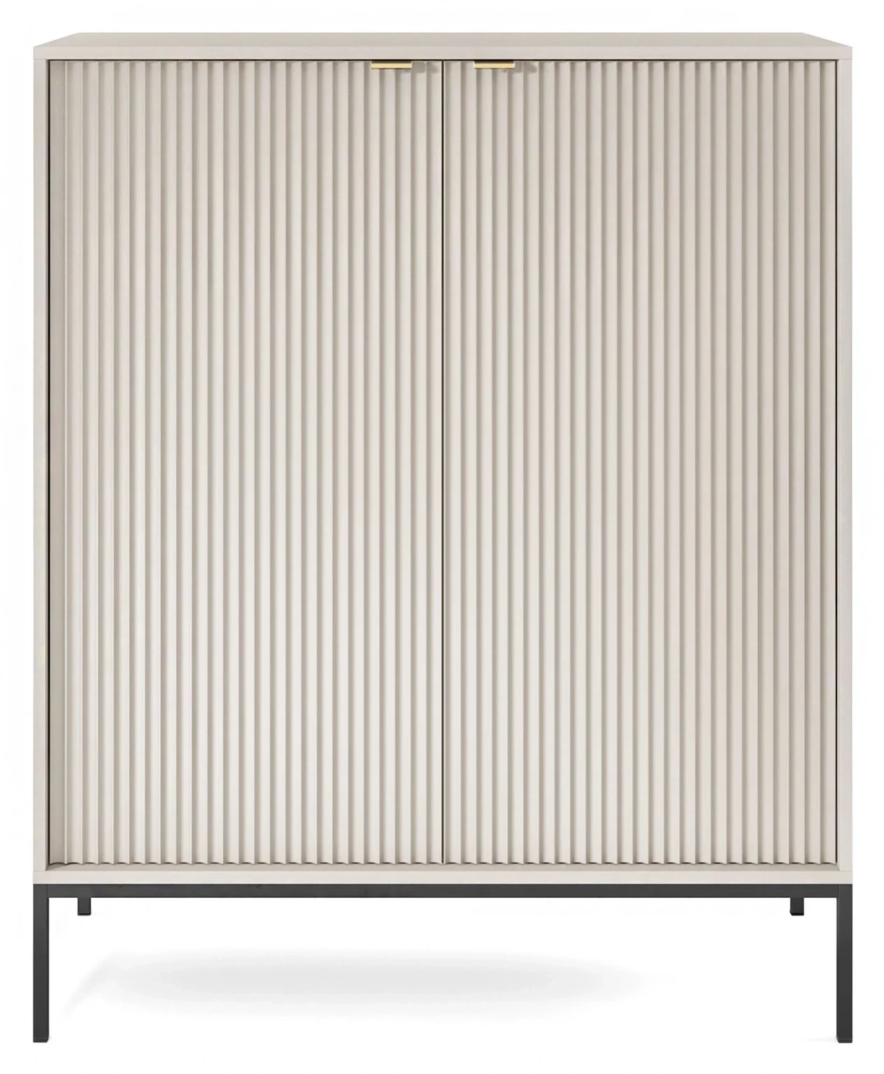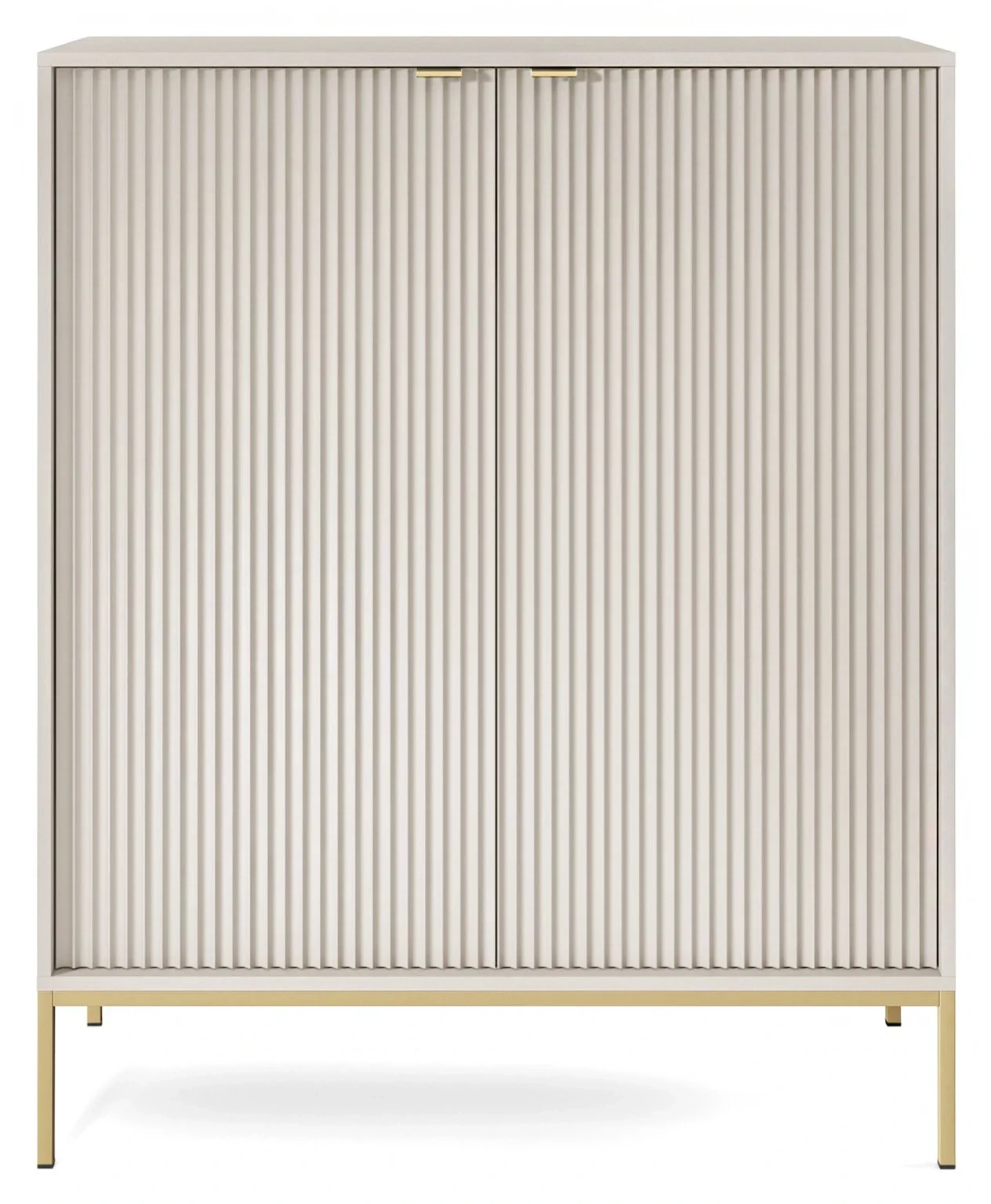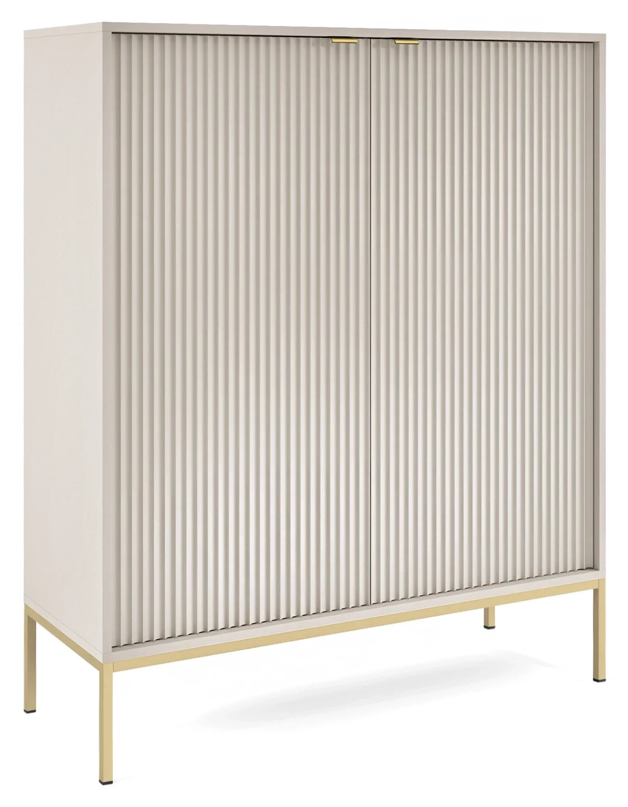 Nova to bardzo pojemna komoda w nowoczesnym stylu. Komoda została wyposażona w 4 półki (co daje aż 6 przestrzeni użytkowych), dzięki czemu stanowi idealne miejsce do przechowywania ubrań oraz pozostałych elementów garderoby, jak czapki, szale itp. Komoda sprawdzi się zarówno w salonie, sypialni, jak też pokoju przedpokoju, czy pokoju młodzieżowym. Nowoczesny, minimalistyczny design połączony z kaszmirowym kolorem sprawia, że komoda Nova prezentuje się niezwykle stylowo i nowocześnie. Prosta ale elegancka forma z dekoracyjnym ryflowaniem na frontach to must have dla miłośników nowoczesnego designu. Metalowa podstawa nadaje lekkości konstrukcji, a całości dopełniają ozdobne uchwyty w kolorze złotym. Mebel został zaprojektowany i wykonany w Polsce co jest gwarancją jakości - Wspieraj
