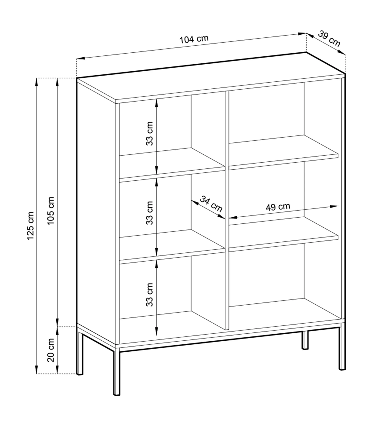 - Wysokość szafki: 125 cm (razem z nóżkami)