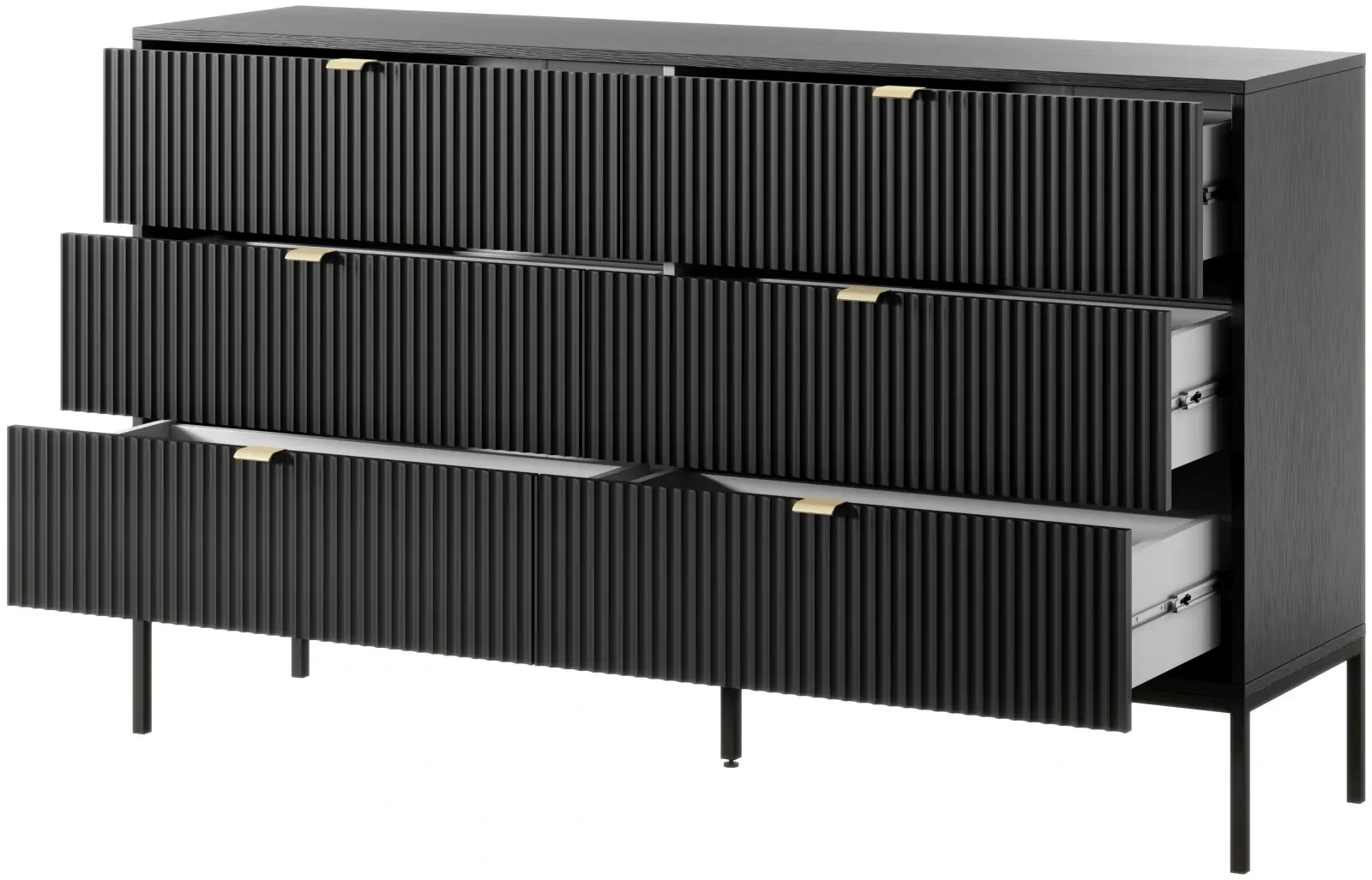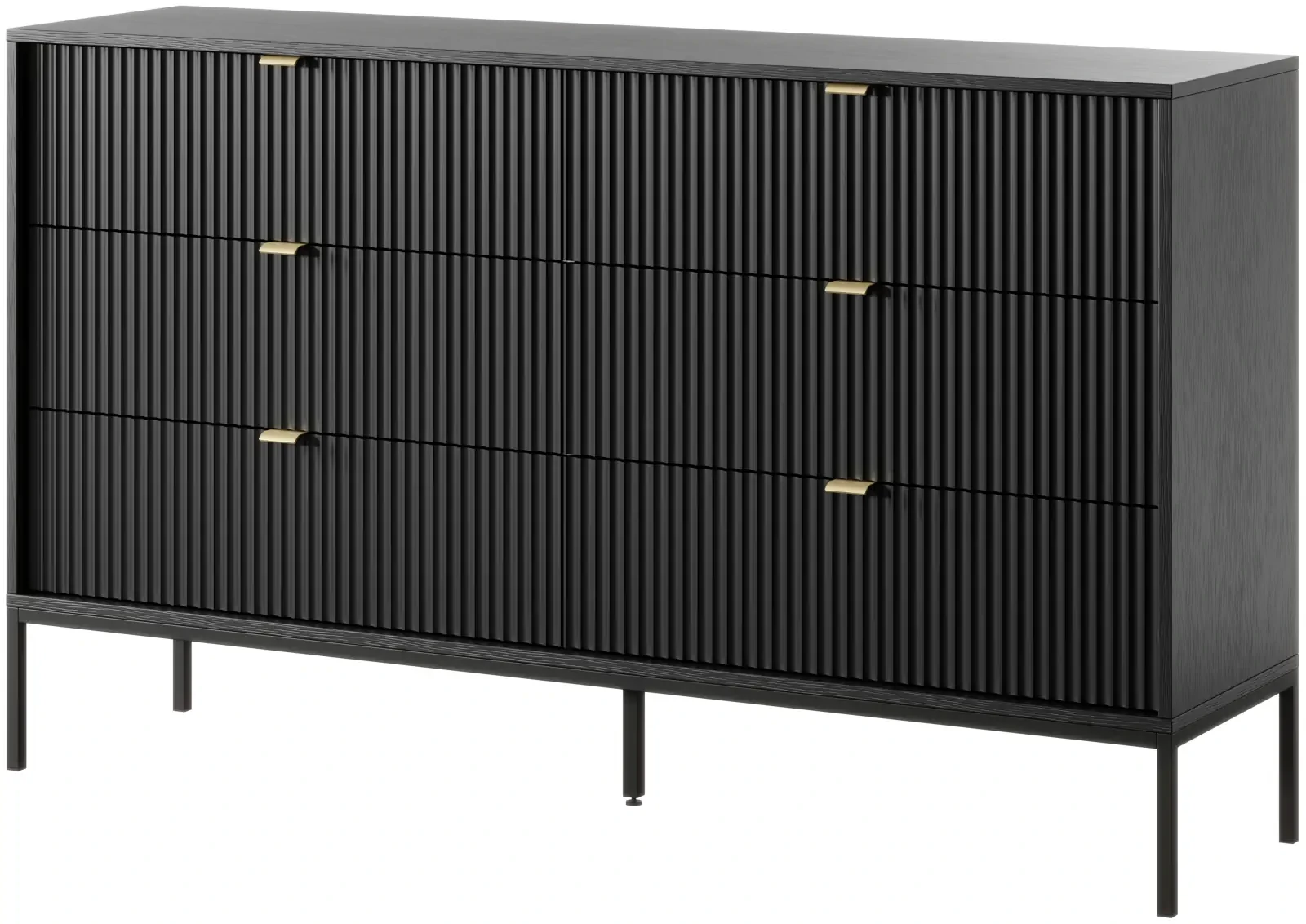 Komoda z serii Nova to pojemny i nowoczesny mebel. Komoda została wyposażona w pojemne szuflady, dzięki czemu stanowi idealne miejsce do przechowywania ubrań oraz pozostałych elementów garderoby, takich jak czapki, szale itp. Komoda sprawdzi się zarówno w salonie, sypialni, jak też pokoju młodzieżowym czy przedpokoju. Nowoczesny, minimalistyczny design połączony z wyrazistym kolorem czerni sprawia, że komoda Nova prezentuje się niezwykle stylowo i nowocześnie. Prosta ale elegancka forma z dekoracyjnym ryflowaniem na frontach to must have dla miłośników nowoczesnego designu. Metalowa podstawa nadaje lekkości konstrukcji a całości dopełniają ozdobne uchwyty w kolorze złotym. Mebel został zaprojektowany i wykonany w Polsce co jest gwarancją jakości - Wspieraj