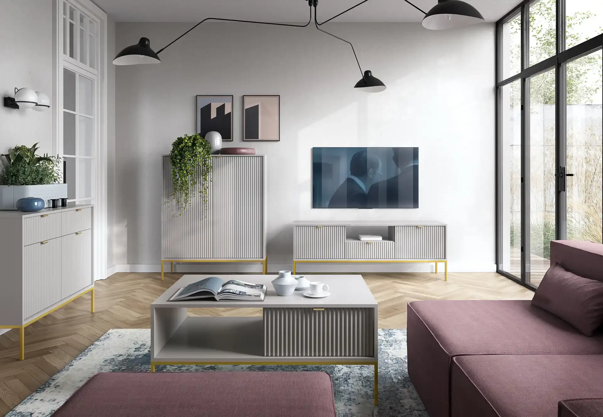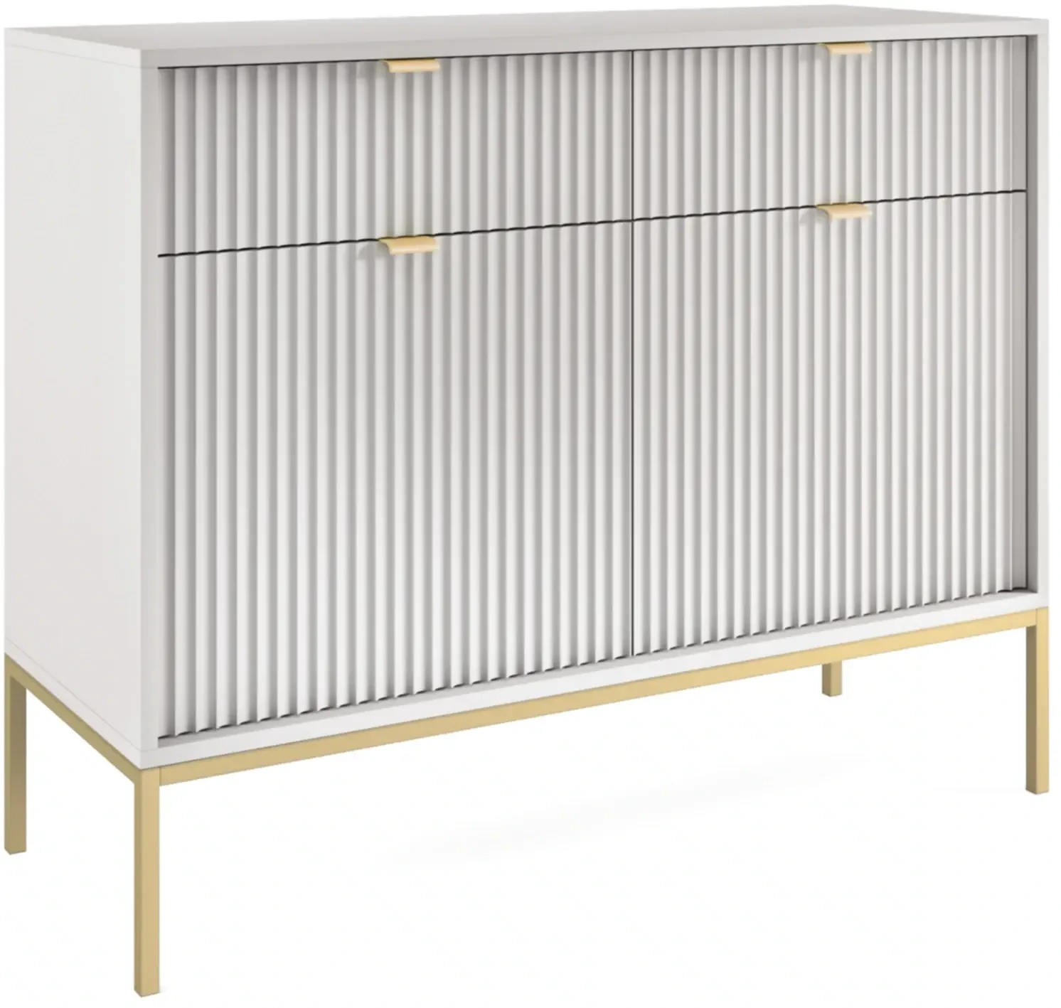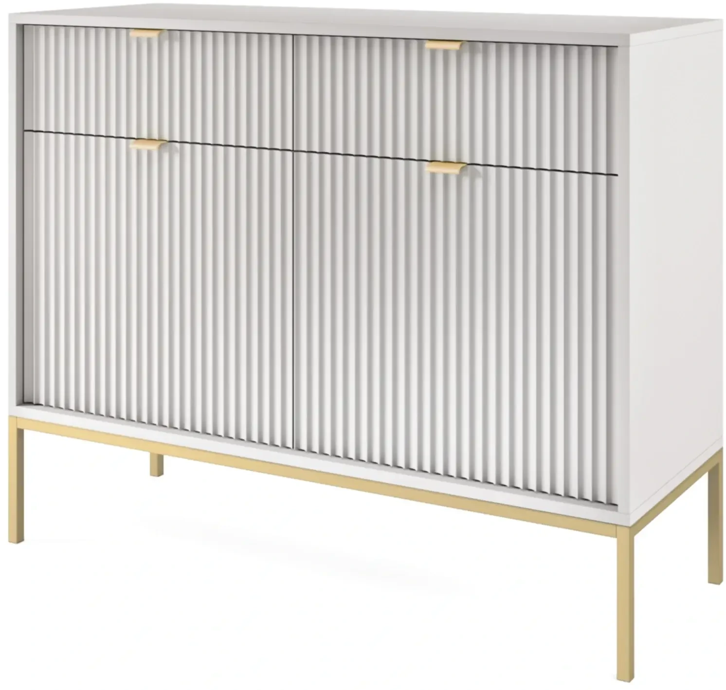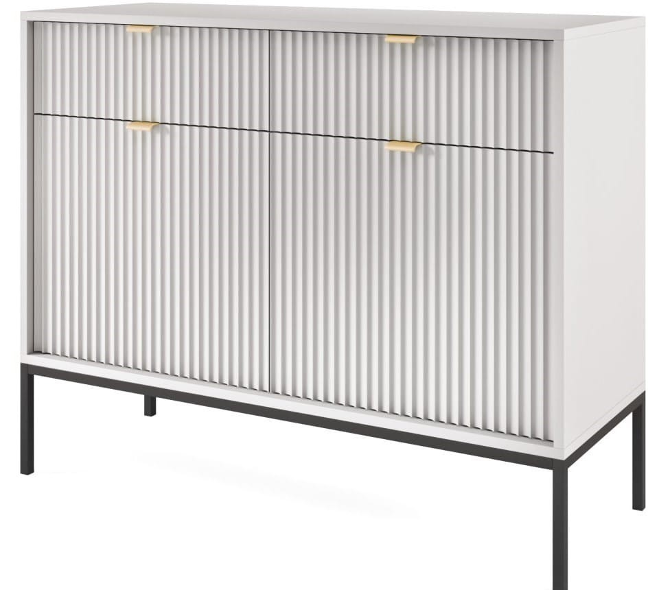 Komoda Novo to pojemny i nowoczesny mebel. Komoda została wyposażona w pojemne półki i szuflady, dzięki czemu stanowi idealne miejsce do przechowywania ubrań oraz pozostałych elementów garderoby, takich jak czapki, szale itp. Komoda sprawdzi się zarówno w salonie, sypialni, jak też pokoju młodzieżowym czy przedpokoju. Nowoczesny, minimalistyczny design połączony z delikatnym szarym kolorem sprawia, że komoda Nova prezentuje się niezwykle stylowo i nowocześnie. Prosta ale elegancka forma z dekoracyjnym ryflowaniem na frontach to must have dla miłośników nowoczesnego designu. Metalowa podstawa nadaje lekkości konstrukcji a całości dopełniają ozdobne uchwyty w kolorze złotym. Mebel został zaprojektowany i wykonany w Polsce co jest gwarancją jakości - Wspieraj