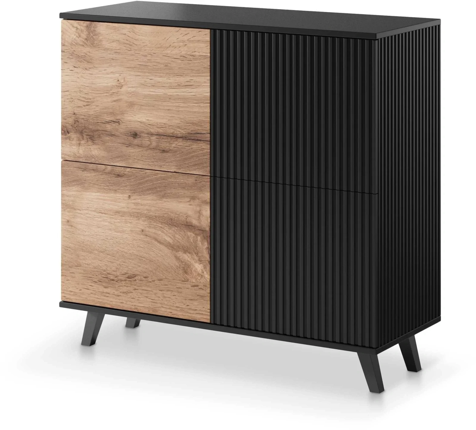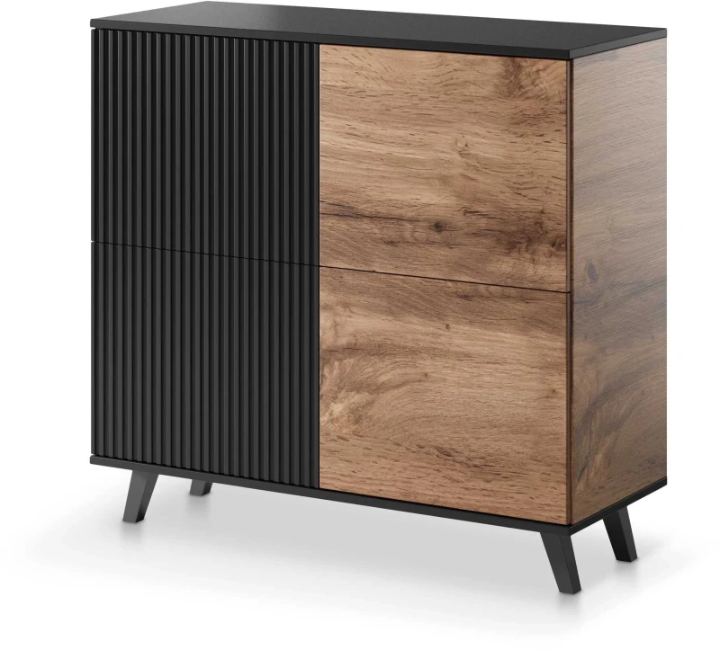 - Elegancja i nowoczesność – Stylowy kontrast między głębokim czarnym kolorem a naturalnym odcieniem dębu wotan nadaje komodzie wyjątkowy, nowoczesny charakter, który doskonale komponuje się z różnorodnymi stylami wnętrzarskimi.