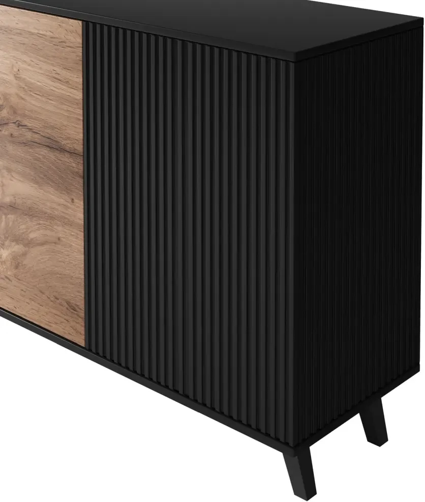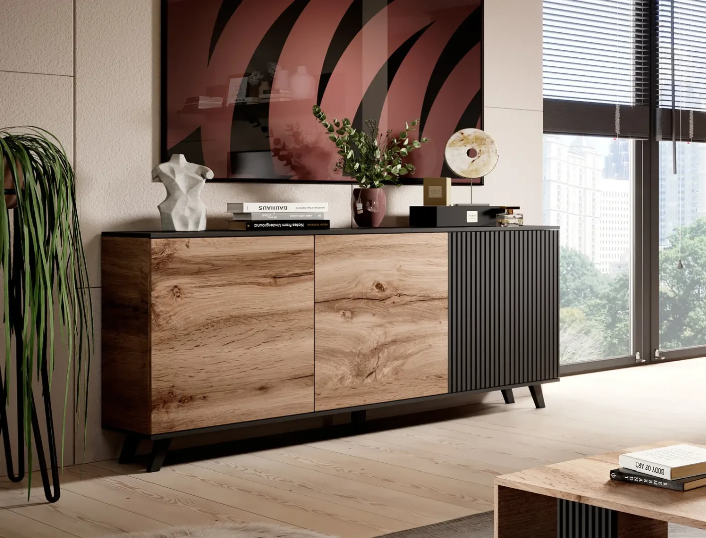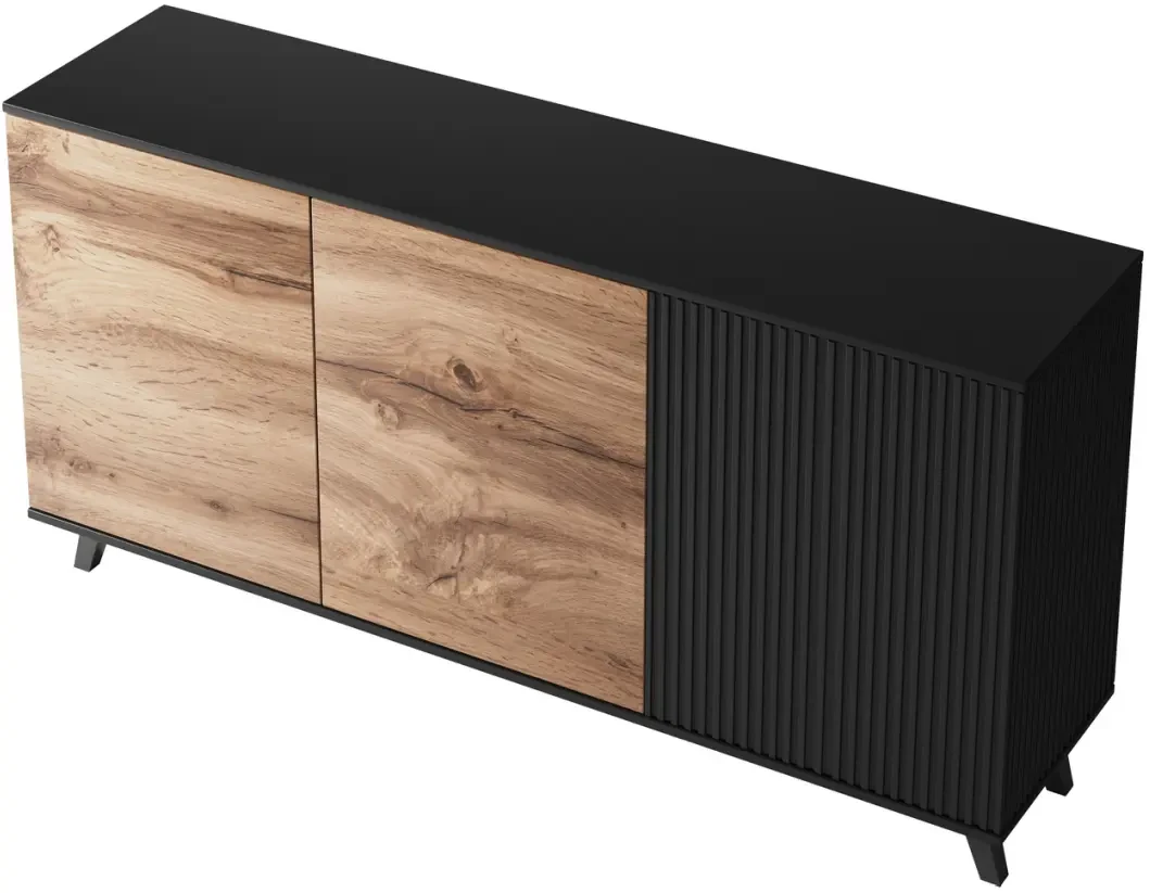 Komoda RANDOM KM-1 to połączenie elegancji i funkcjonalności w nowoczesnym wydaniu. Jej prosty, geometryczny kształt oraz kontrastowe zestawienie kolorów – ciepłego dębu wotan i głębokiej czerni – tworzą efektowny mebel, który doskonale wpisze się w aranżacje salonu, sypialni czy przedpokoju.