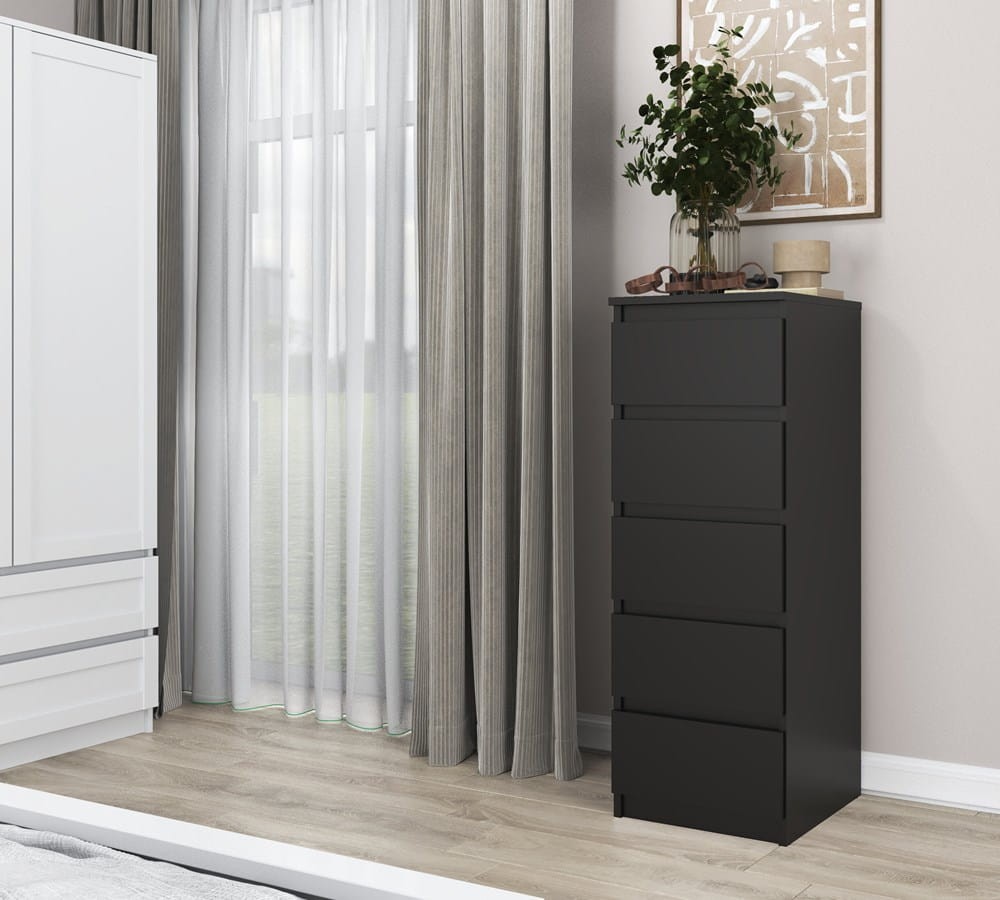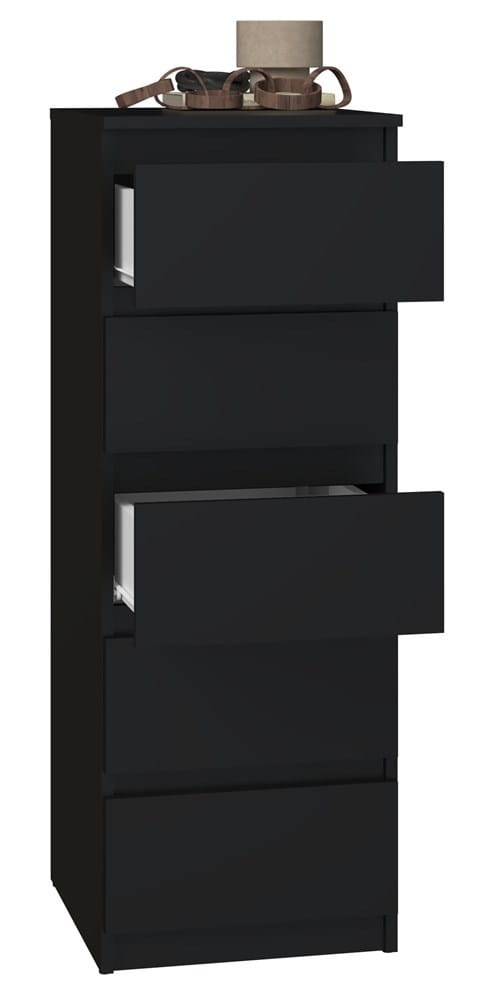 Wysoka komoda Bona 5 oferuje mnóstwo miejsca do przechowywania, a nie zajmuje dużo miejsca. Bezuchwytowe, fronty szuflad zapewniają wygodne użytkowanie i podkreślą modernistyczny charakter wnętrza.