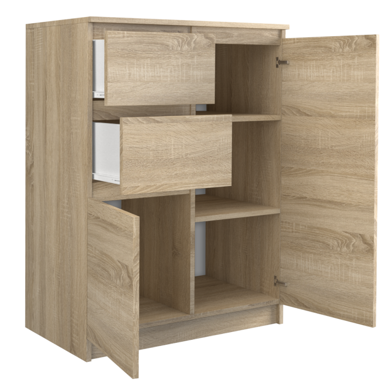 Nowoczesna komoda Sergiusz to funkcjonalny i pakowny mebel, który urządzi wnętrze Twojej sypialni, salonu lub pokoju dziecka. Uniwersalny wygląd sprosta oczekiwaniom wszystkich, którzy cenią połączenie prostoty i elegancji. Wnętrze komody składa się z półek oraz dwóch szuflad, które pomogą przy rozmieszczaniu rzeczy. Łatwiej będzie znaleźć to, czego się szuka.