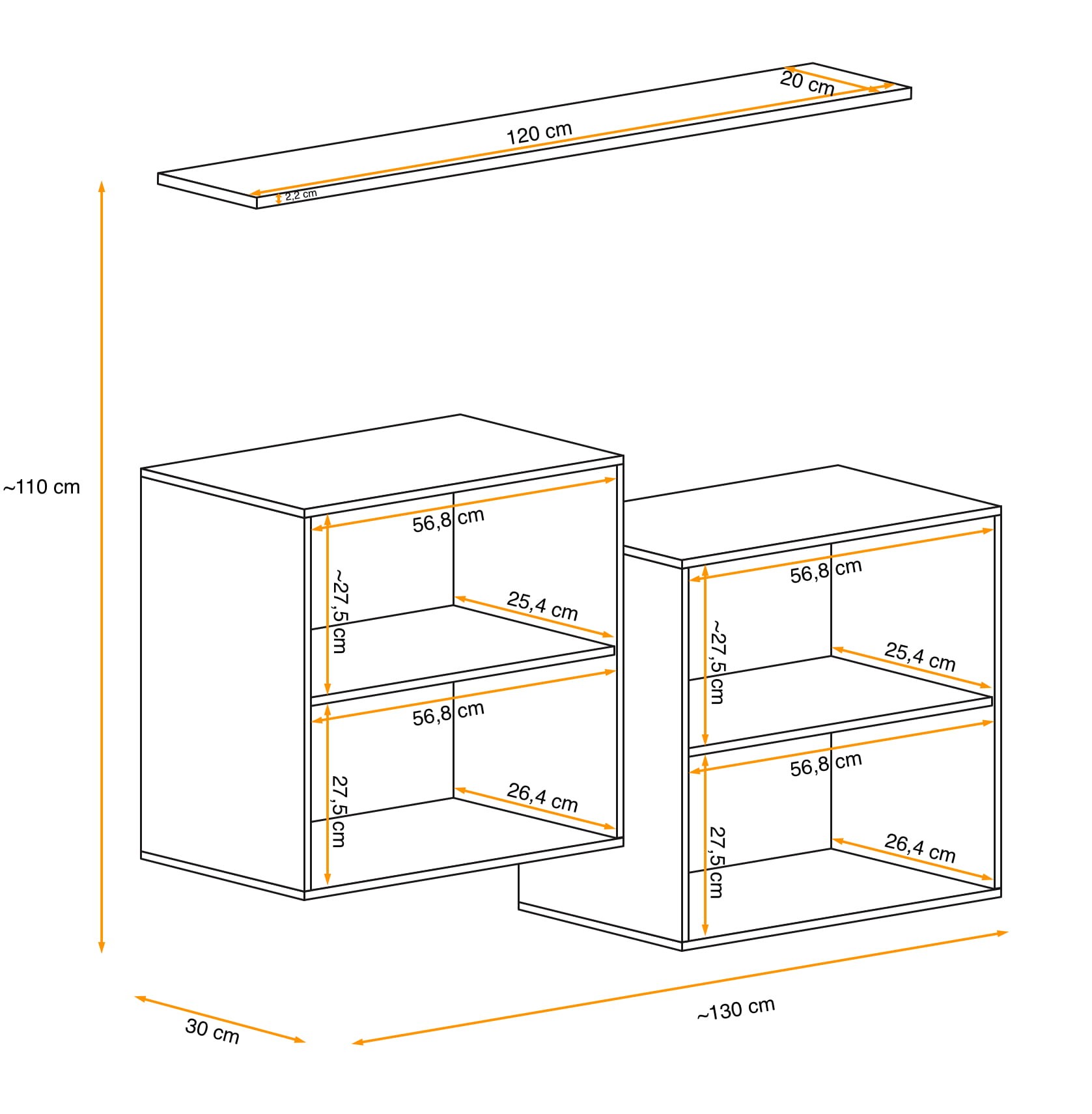 - Całość: ~130 cm (szerokość) x ~110 cm (wysokość) x 30 cm (głębokość)
