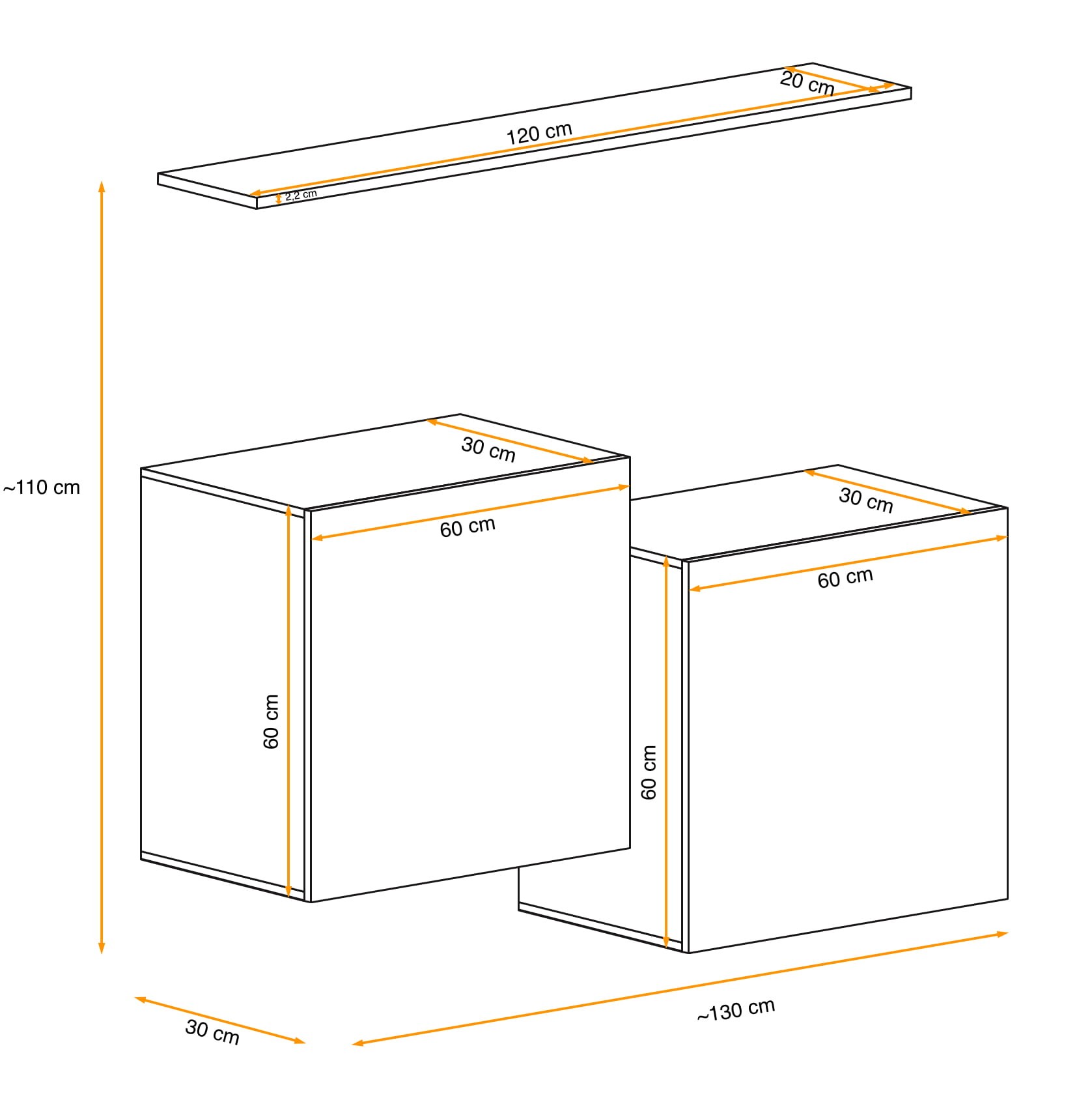 - 2 x Szafka: 60 cm (szerokość) x 60 cm (wysokość) x 30 cm (głębokość)