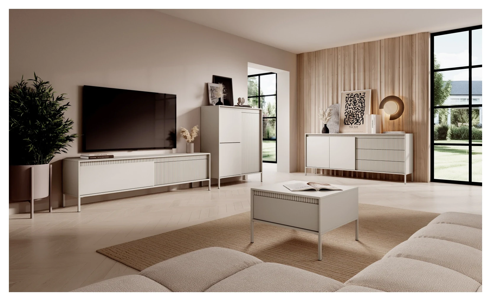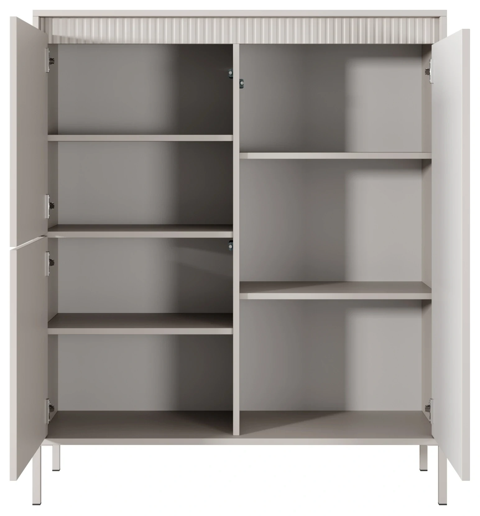 Funkcjonalna i elegancka komoda wysoka Senso w subtelnym odcieniu beżu pozwoli Ci praktycznie zagospodarować przestrzeń w salonie, wprowadzając do wnętrza nutę nowoczesnej harmonii. Dzięki pojemnym półkom za trzema drzwiami z łatwością uporządkujesz domowe akcesoria, zachowując ład i porządek. Charakterystyczne ryflowane elementy frontów oraz delikatnie wysunięte gładkie płyty nadają bryle oryginalnego stylu, a metalowe nogi w kolorze beżowym optycznie ją wysmuklają. System push-to-open zapewnia wygodne użytkowanie i minimalistyczny wygląd. Mebel został zaprojektowany i wykonany w Polsce co jest gwarancją jakości - Wspieraj