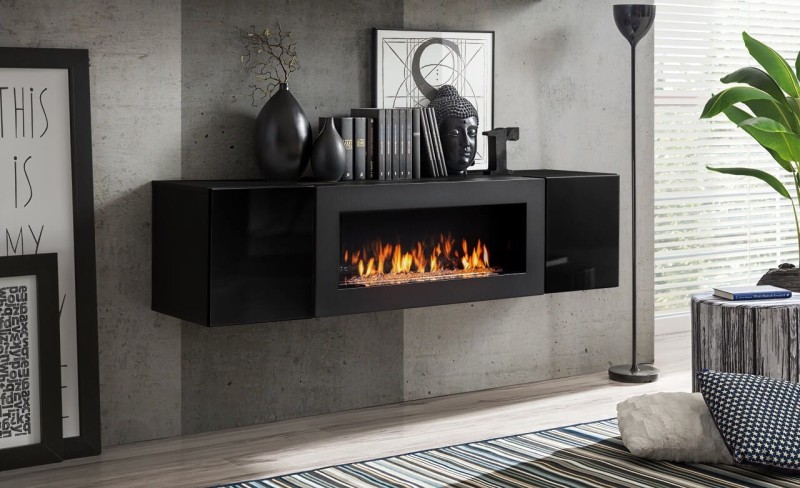 Komoda z kominkiem FLY biały/czarny połysk