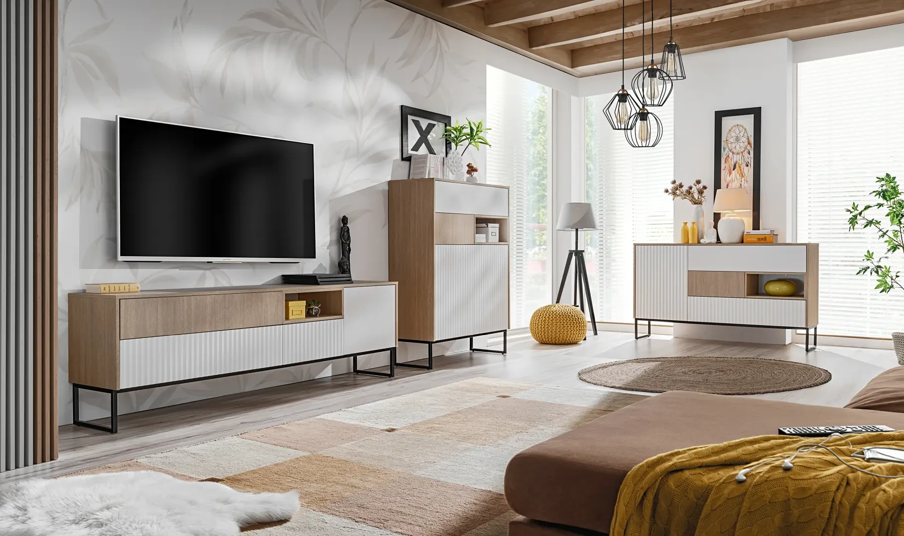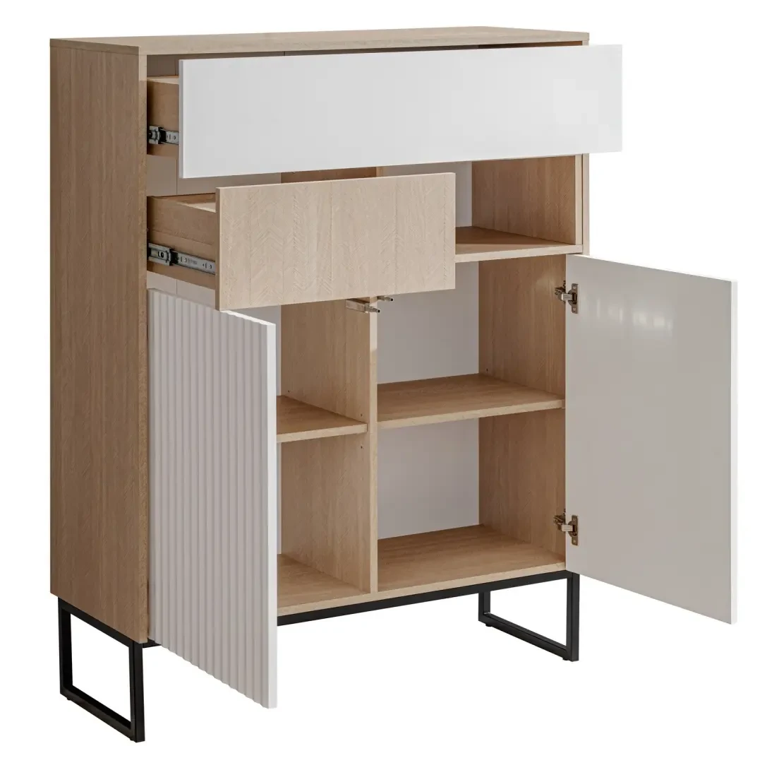 Komoda Zoe 2D2S to starannie wykonany mebel, który jest bardzo pojemny, praktyczny i modny. Komoda Zoe została wyposażona w dwoje drzwi, dwie szuflady oraz jedną otwartą przestrzeń. Dzięki temu komoda jest niezwykle pojemna i pomieści sporo ubrań oraz innych drobiazgów. Komodę wykonano z odpornej na uszkodzenia mechaniczne płyty o grubości 16 mm. Zoe to nietuzinkowa kombinacja gładkich białych i ryflowanych frontów z jodełką scandi. Delikatnie połączenie kolorystyczne uzupełniają metalowe nogi w kolorze czarnym. Zoe to niezwykle uniwersalny system, pasujący do wielu wnętrz.