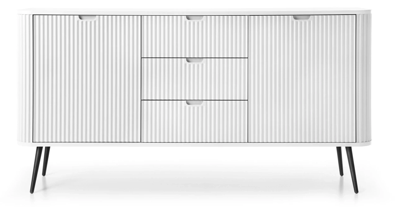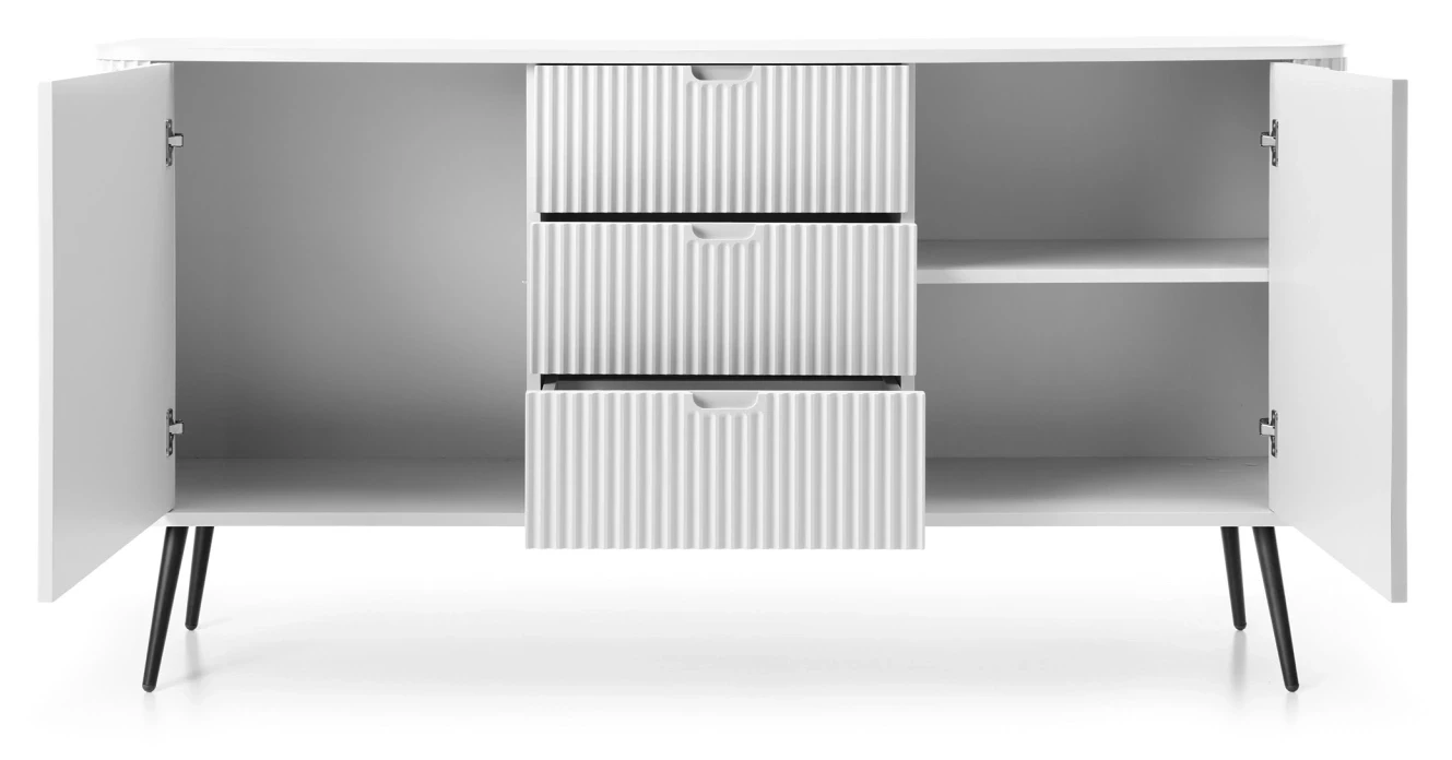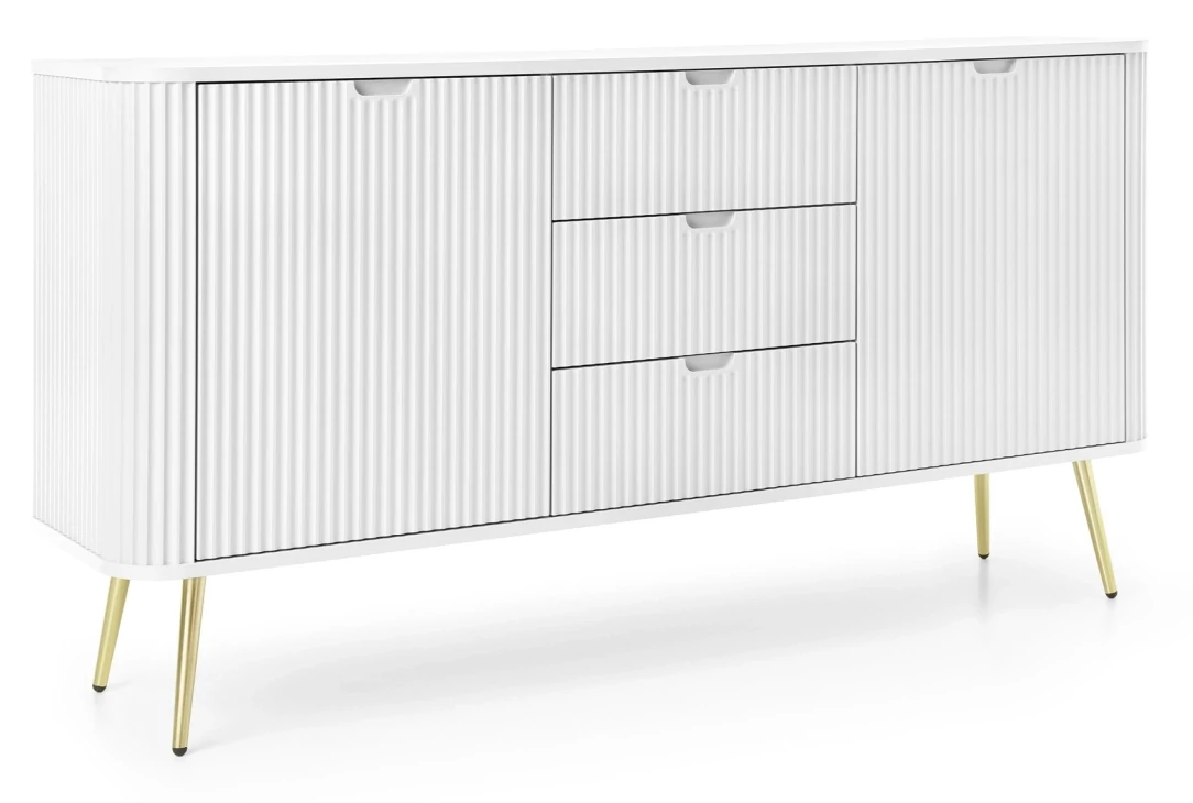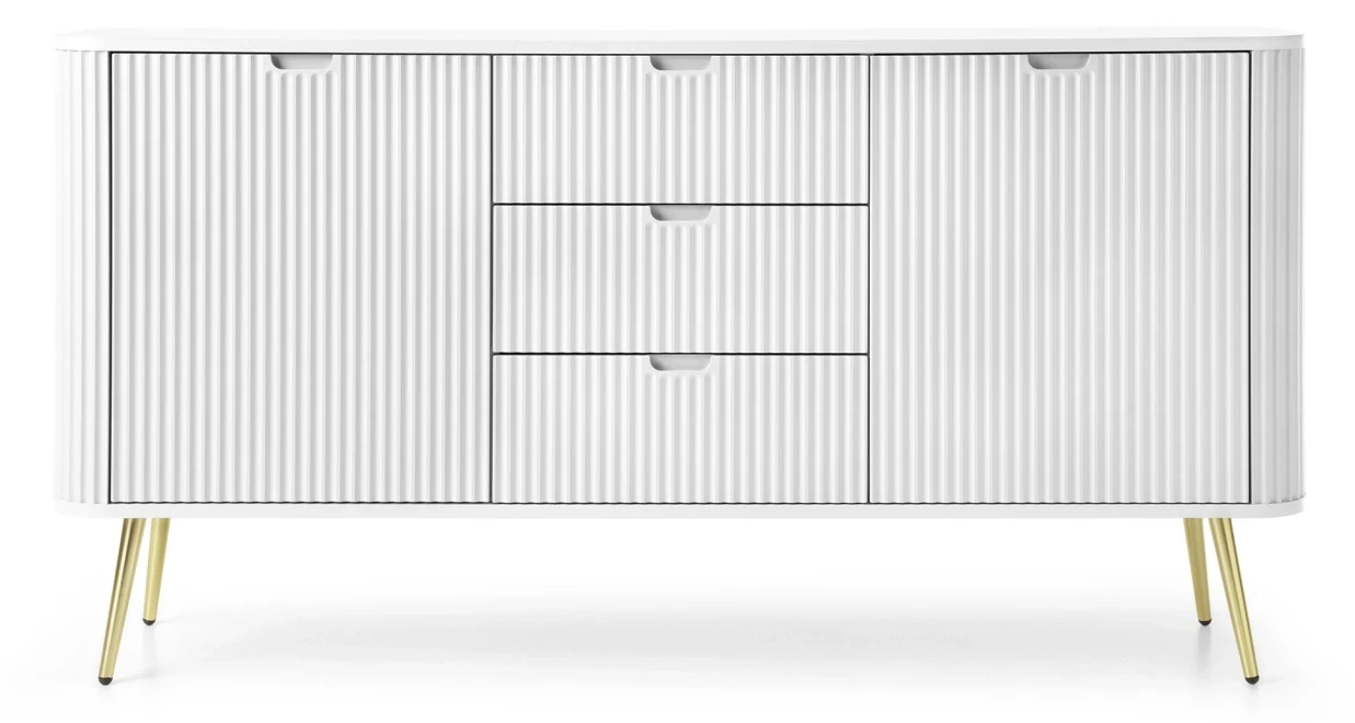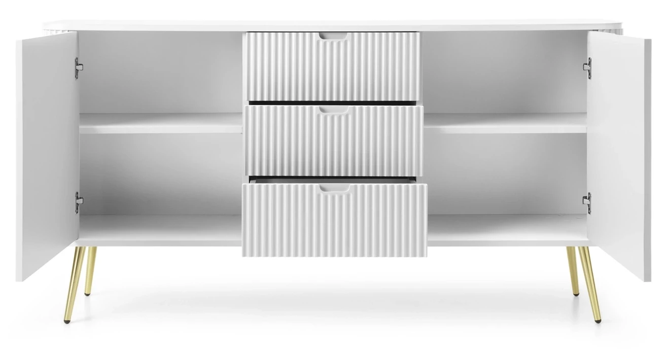 Komoda Zova to bardzo praktyczny mebel w nowoczesnym stylu. Komoda Zova została wyposażona w trzy szuflady oraz dwie zamykane szafki, dzięki czemu stanowi idealne miejsce do przechowywania rzeczy. Szafka Zova sprawdzi się zarówno w nowoczesnym salonie czy sypialni, jak też w bardziej klasycznym wnętrzu. Nowoczesny, minimalistyczny design połączony z frezowanymi frontami sprawia, że komoda Zova prezentuje się niezwykle stylowo i elegancko. Istnieje możliwość wyboru nóżek w kolorze czarnym lub złotym, dzięki czemu jest możliwość dopasowania komody do swojego wnętrza. Mebel został zaprojektowany i wykonany w Polsce co jest gwarancją jakości - Wspieraj