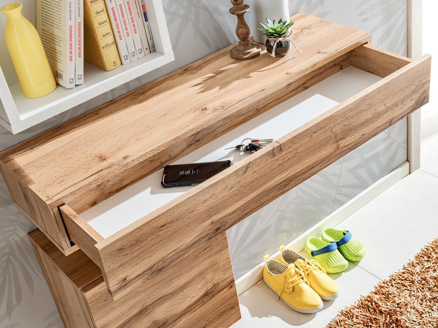 Konsola wykonana jest z wysokiej jakości materiałów – korpus mebla stworzony jest z płyty laminowanej, co zapewnia trwałość i odporność na codzienne użytkowanie. Front wykończony folią PVC, utrzymany w naturalnym odcieniu Wotan, wprowadza ciepły i przytulny akcent do wnętrza. Wykończenie w macie sprawia, że konsola wygląda nowocześnie, a jednocześnie subtelnie. Jest to idealny wybór do przedpokoju, salonu czy sypialni, gdzie spełni zarówno funkcję dekoracyjną, jak i praktyczną.