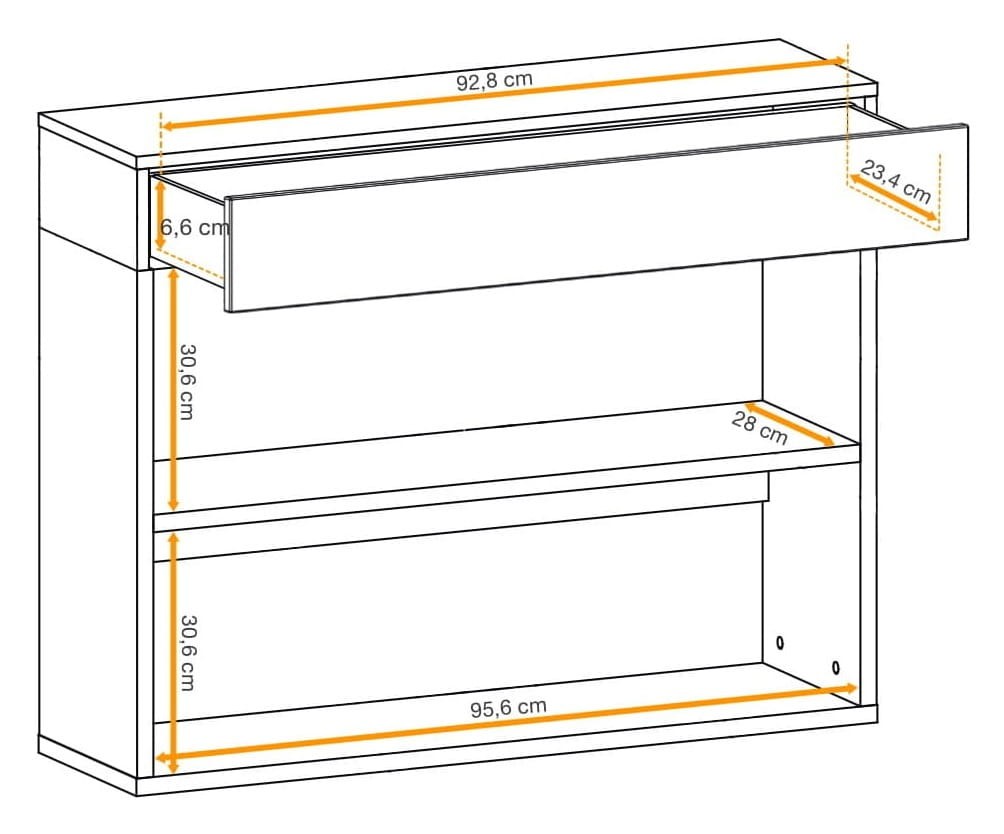 Mebel wyposażony jest w pojemną szufladę oraz dwie przestronne półki, co pozwala na wygodne przechowywanie różnych przedmiotów – od dekoracji po książki i drobiazgi codziennego użytku. Szuflada, umieszczona na górze, to świetne miejsce na przechowywanie drobnych przedmiotów, które chcemy mieć pod ręką, ale jednocześnie ukryte przed wzrokiem. Dwie półki umieszczone poniżej szuflady oferują dodatkowe miejsce do ekspozycji dekoracji, książek czy innych przedmiotów, które możemy mieć zawsze na widoku.