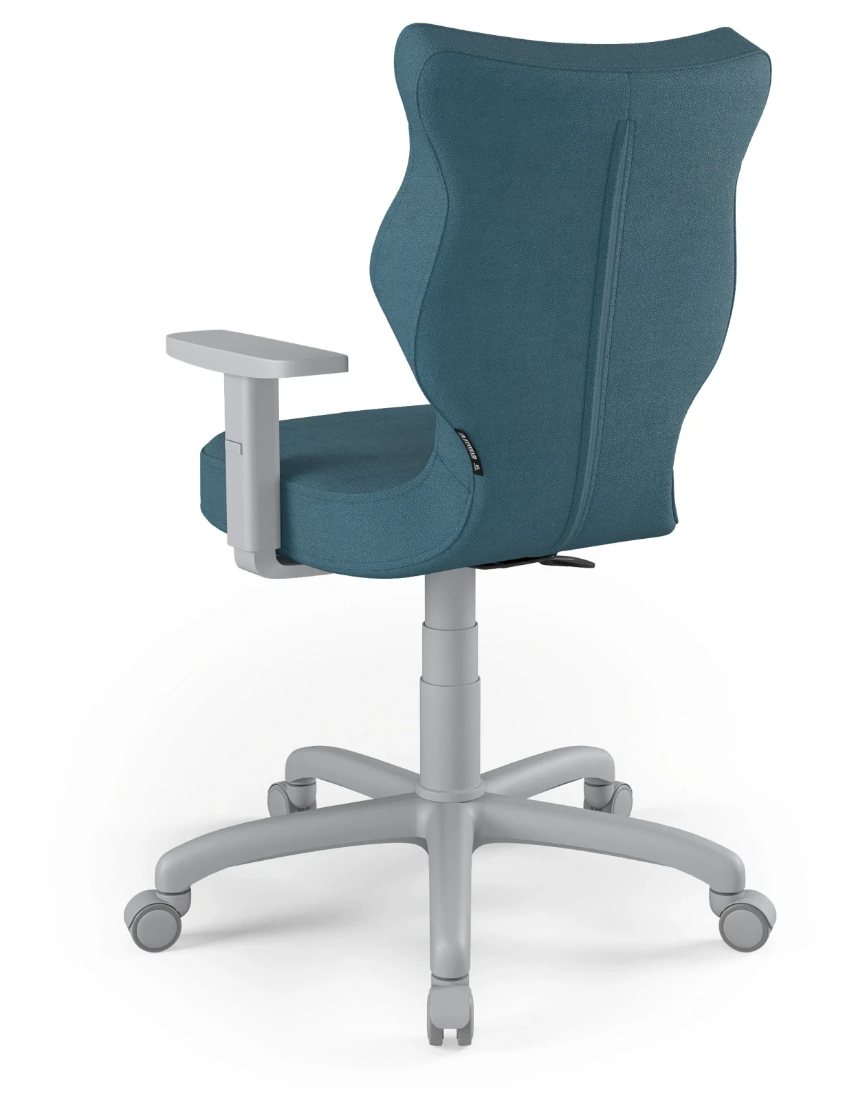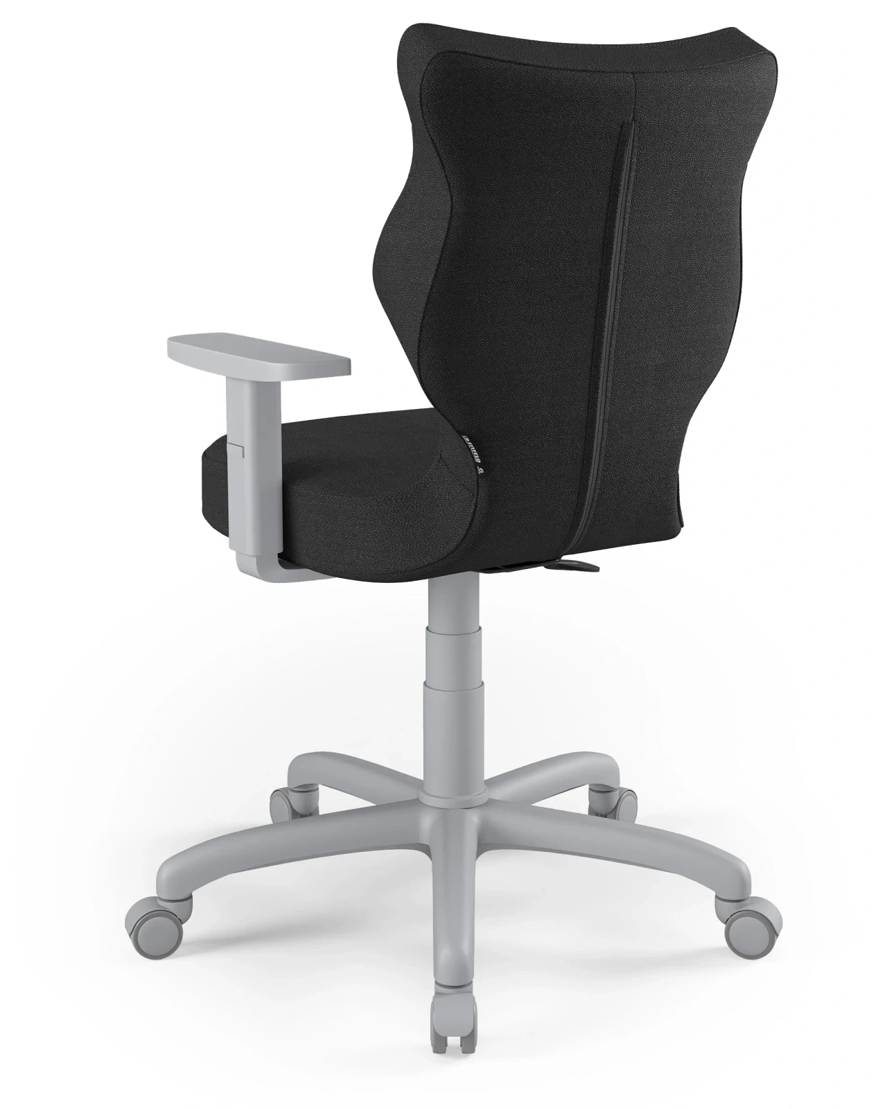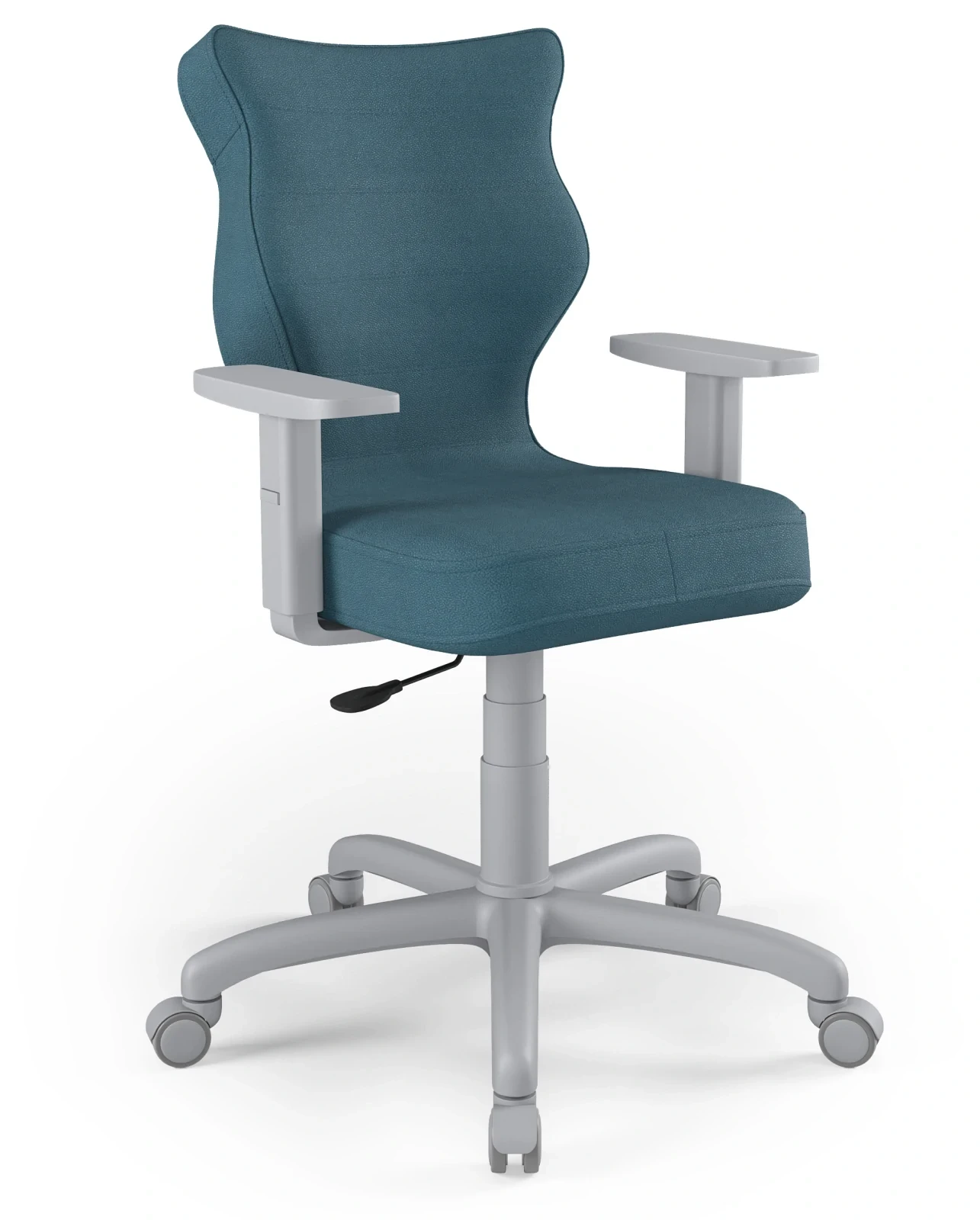 - Regulowane podłokietniki – możliwość ustawienia wysokości w zakresie 12,5–20 cm zapewnia optymalne ułożenie ramion i odciążenie barków.