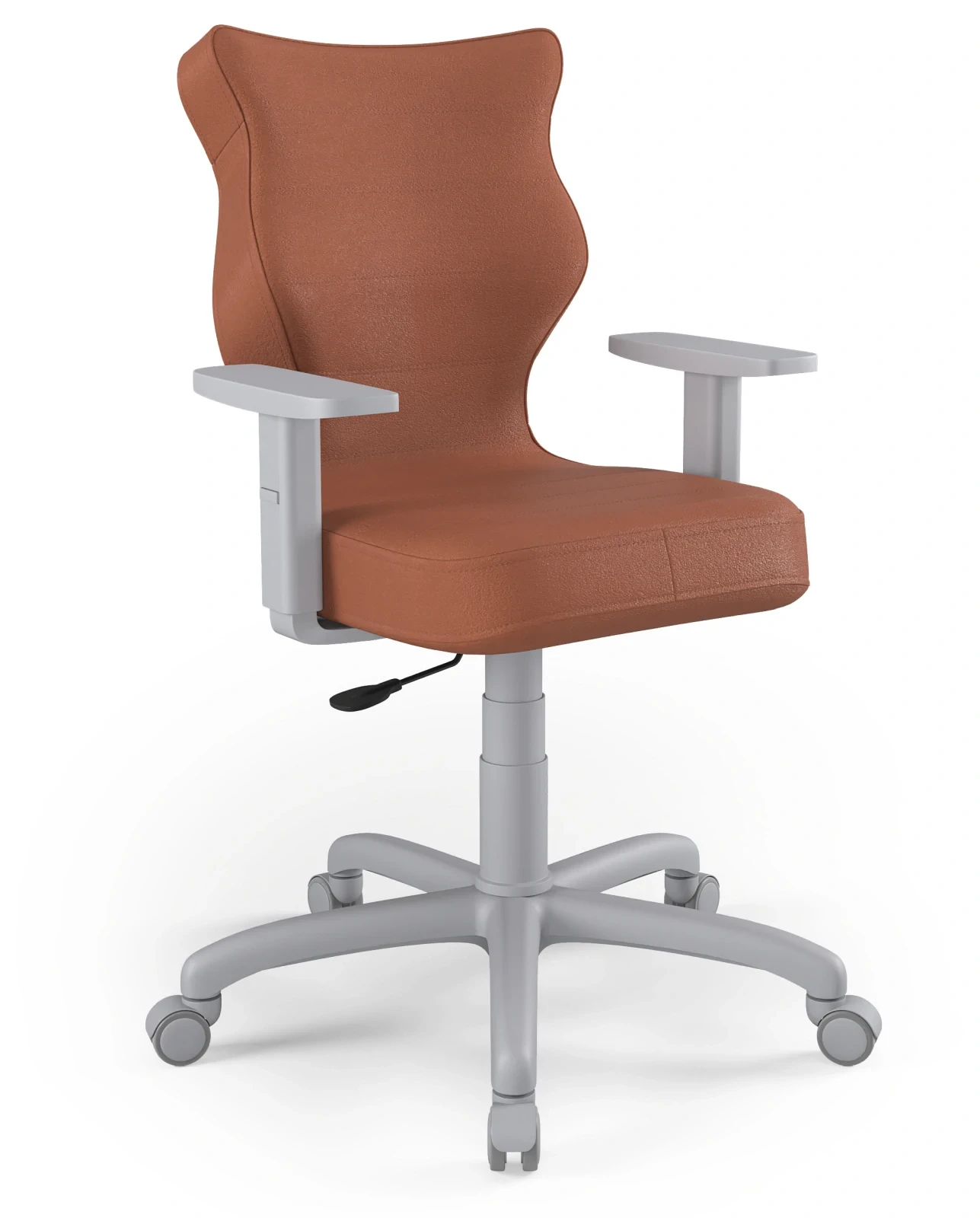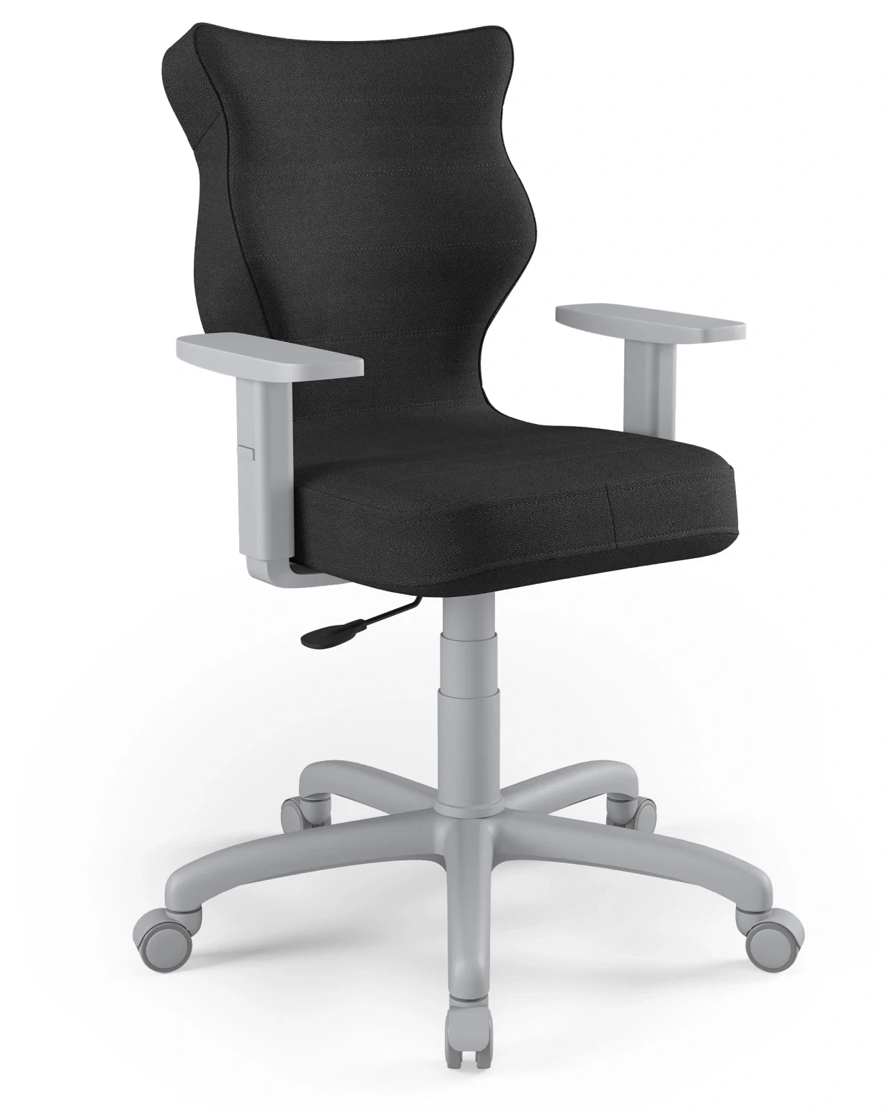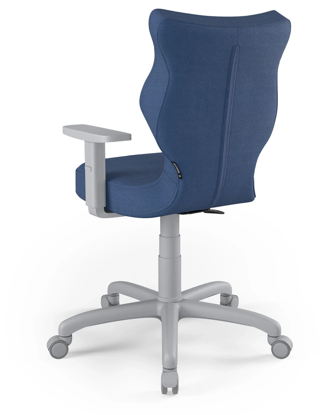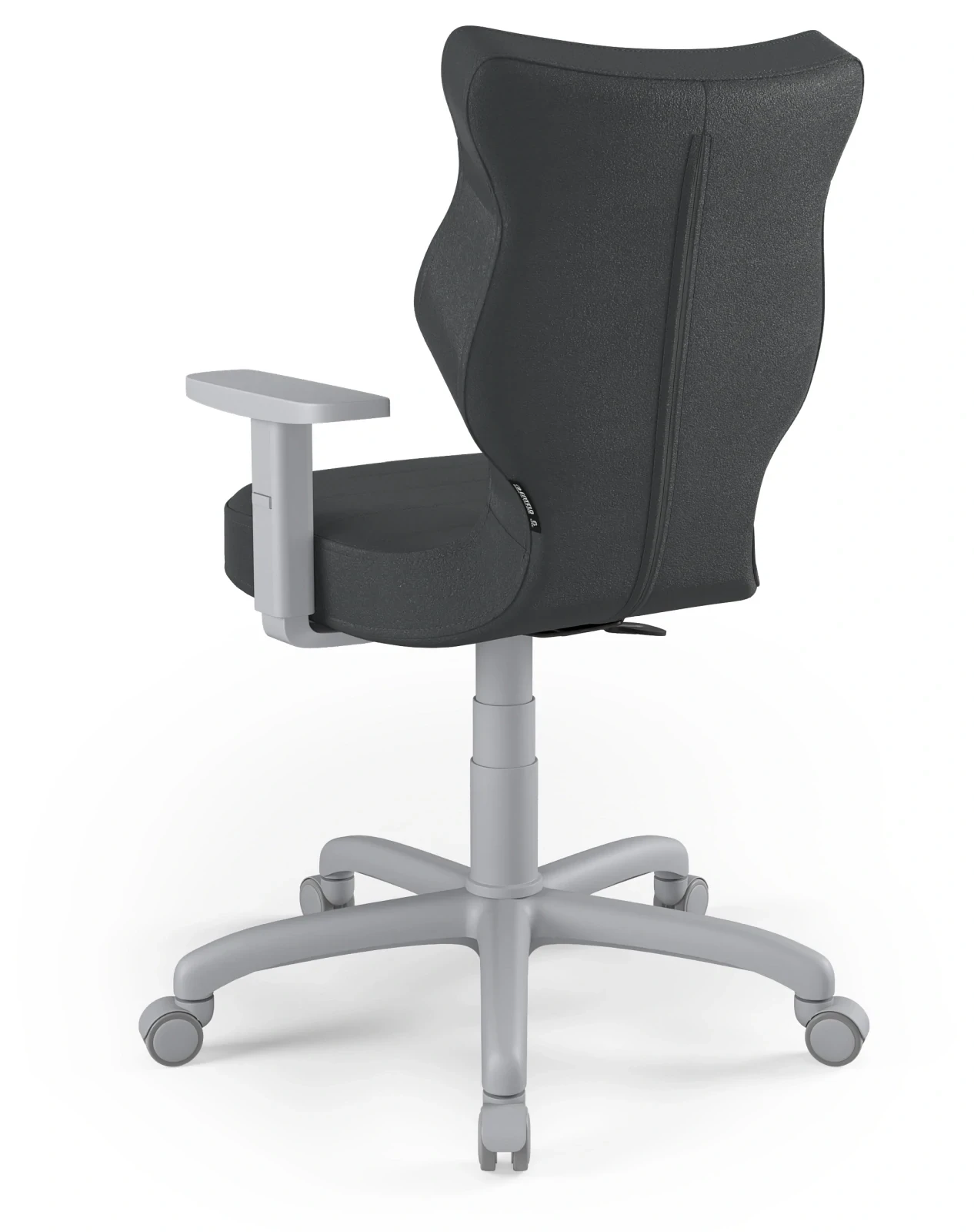 - Regulowane podłokietniki – możliwość ustawienia wysokości w zakresie 12,5–20 cm zapewnia optymalne ułożenie ramion i odciążenie barków.