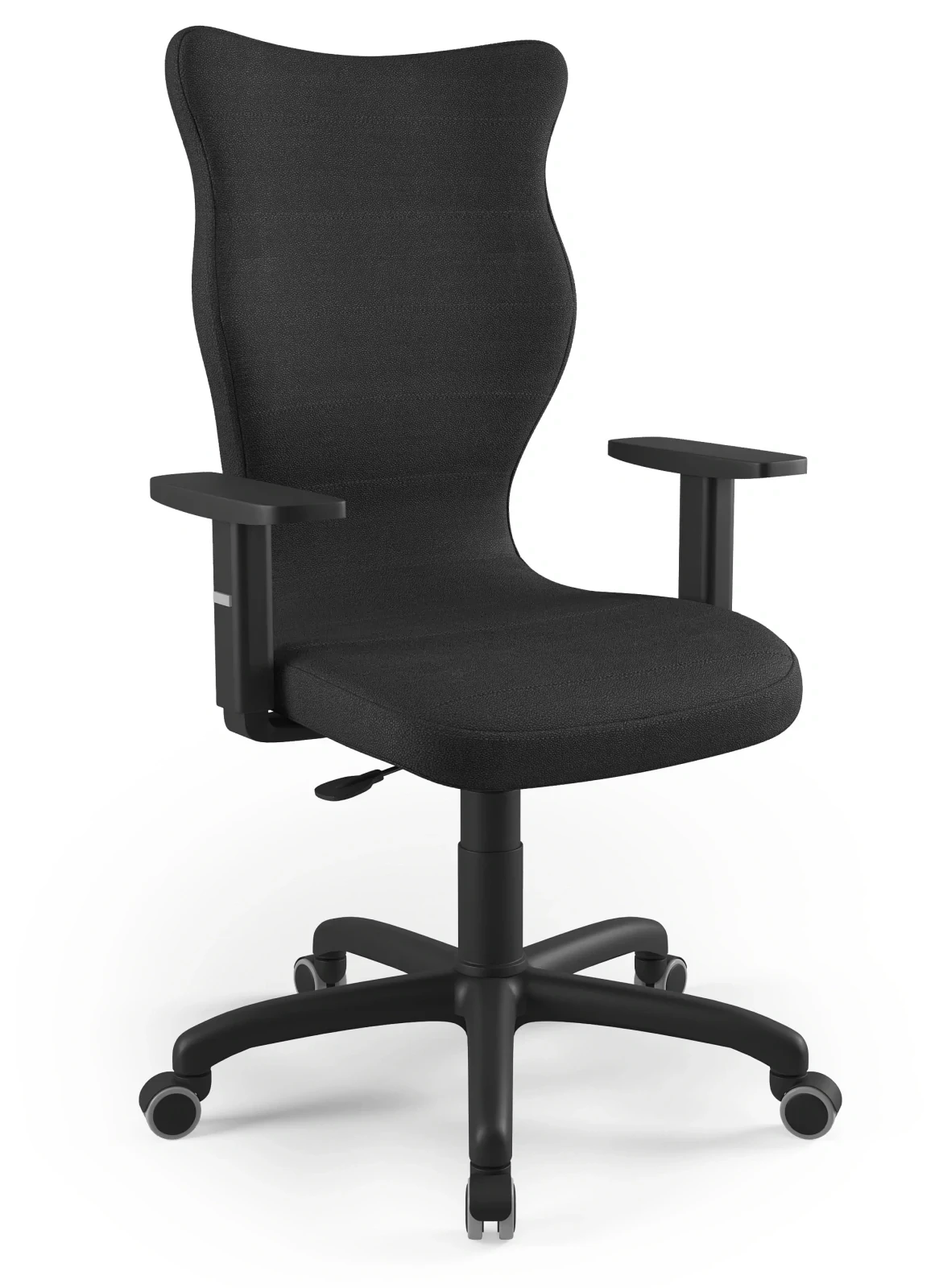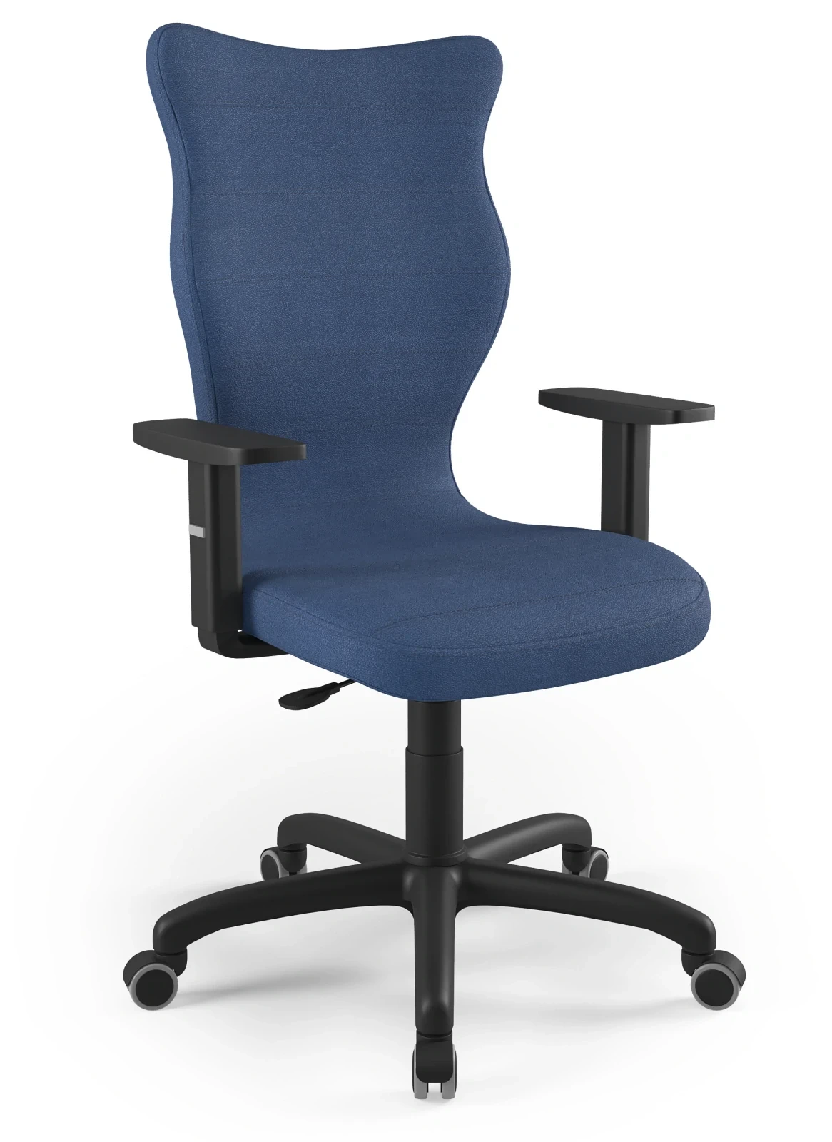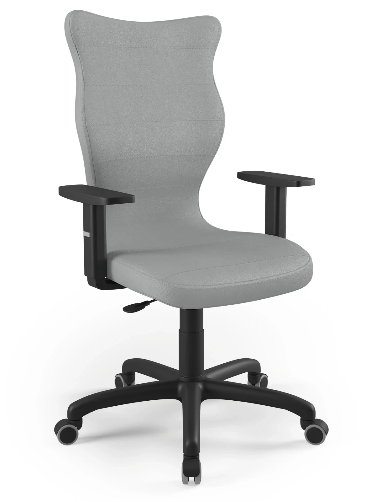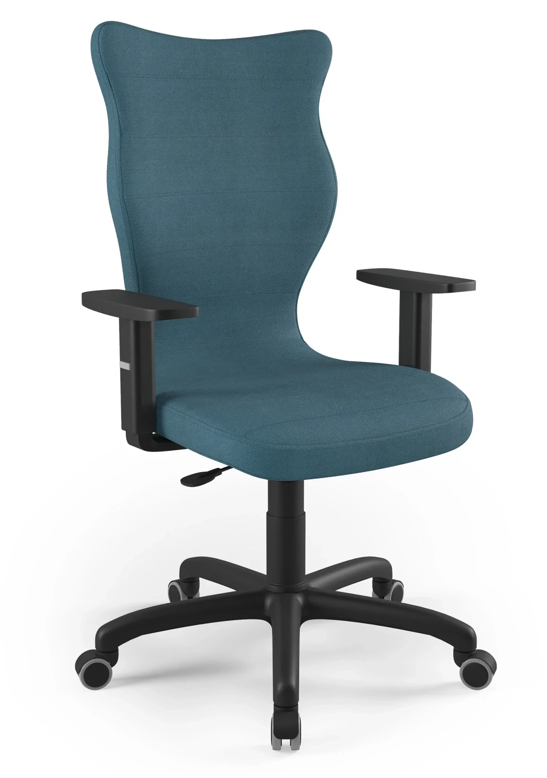 - Regulowane podłokietniki – możliwość ustawienia wysokości w zakresie 15,5–23 cm zapewnia optymalne ułożenie ramion i odciążenie barków.