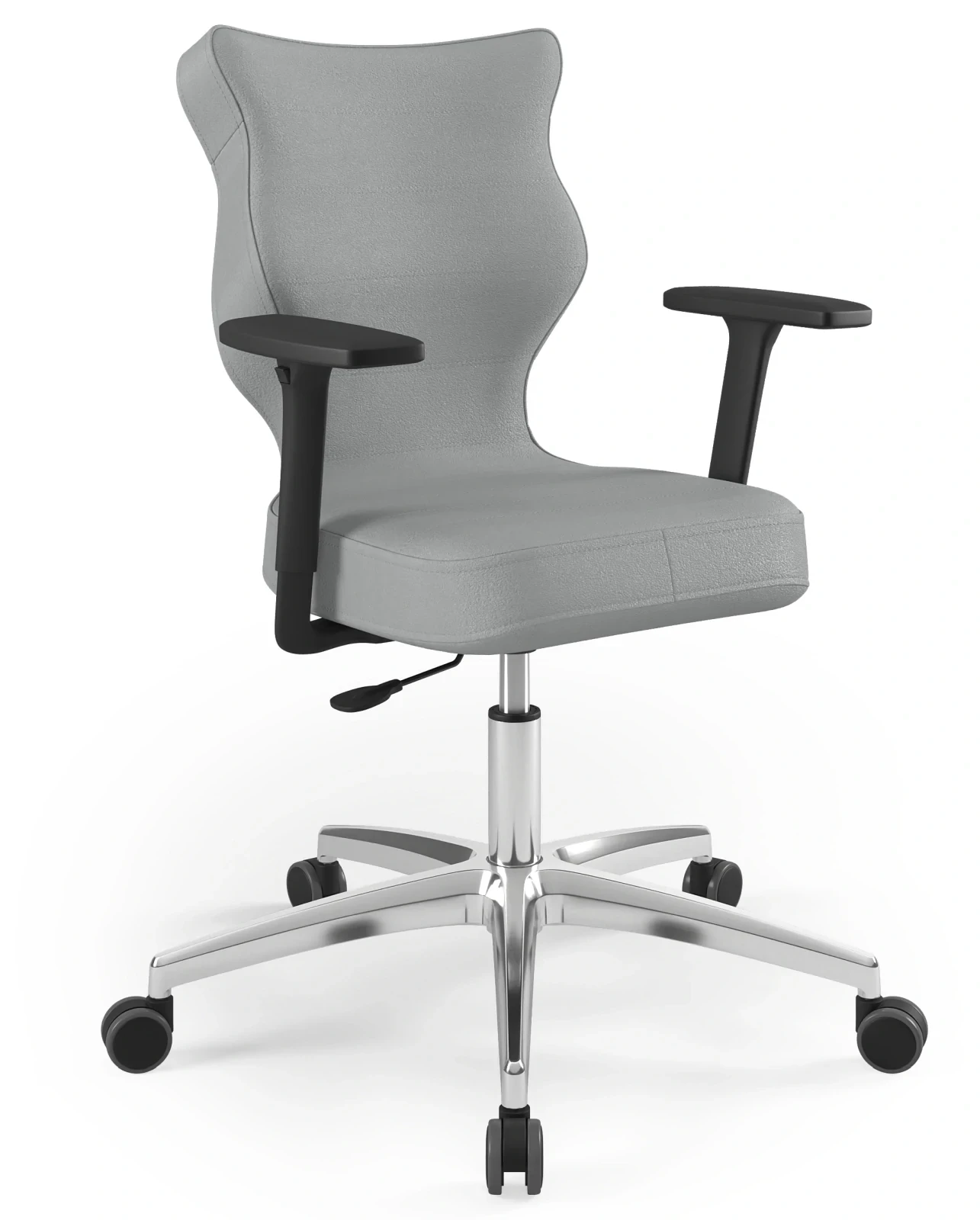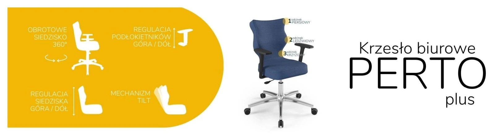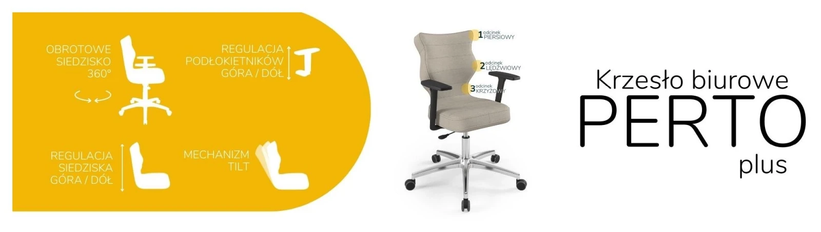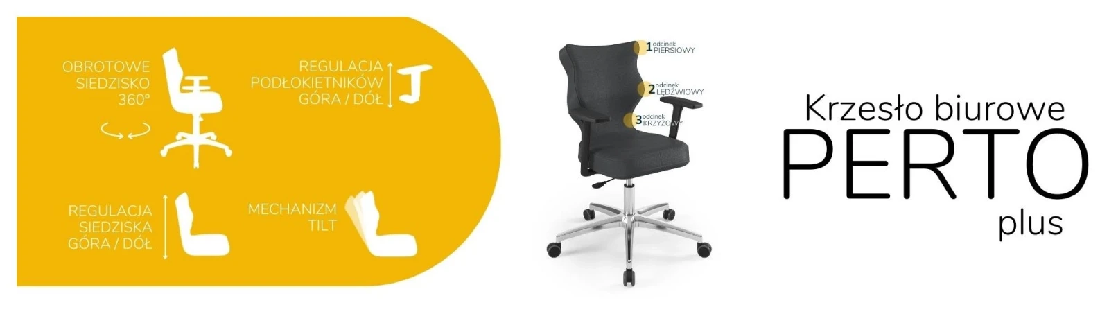 Krzesło obrotowe Perto Plus to ulepszona wersja klasycznego modelu Perto, oferująca jeszcze większy komfort i funkcjonalność. Wyposażone w polerowaną aluminiową podstawę, prezentuje się elegancko i nowocześnie, idealnie wpisując się w aranżacje biur i gabinetów. Ergonomiczny kształt siedziska i oparcia wspiera prawidłową postawę ciała, a regulowane podłokietniki oraz wysokość siedziska pozwalają na pełne dopasowanie do potrzeb użytkownika. Model dedykowany jest osobom o wzroście od 159 do 188 cm, gwarantując wygodę podczas wielogodzinnej pracy lub nauki.