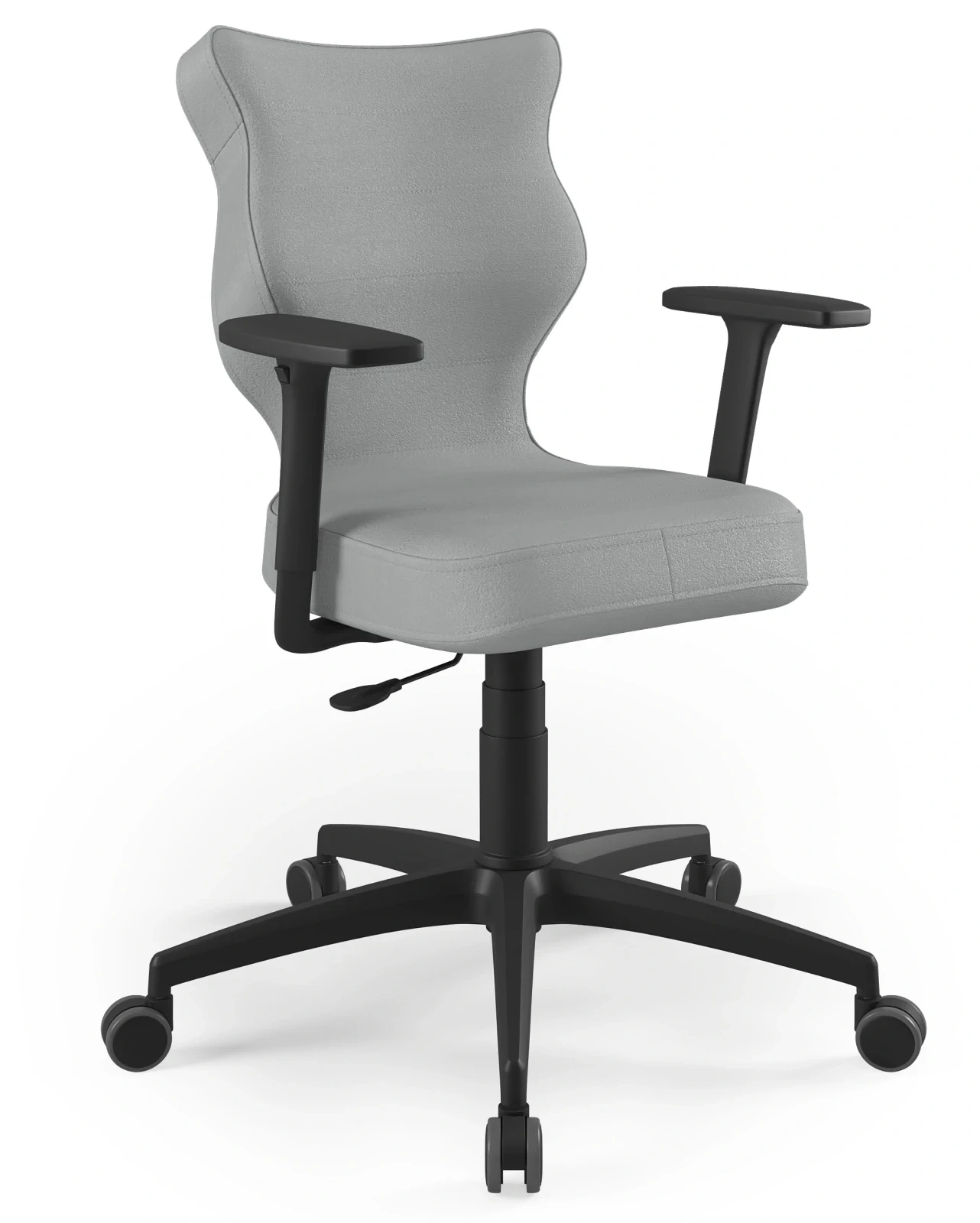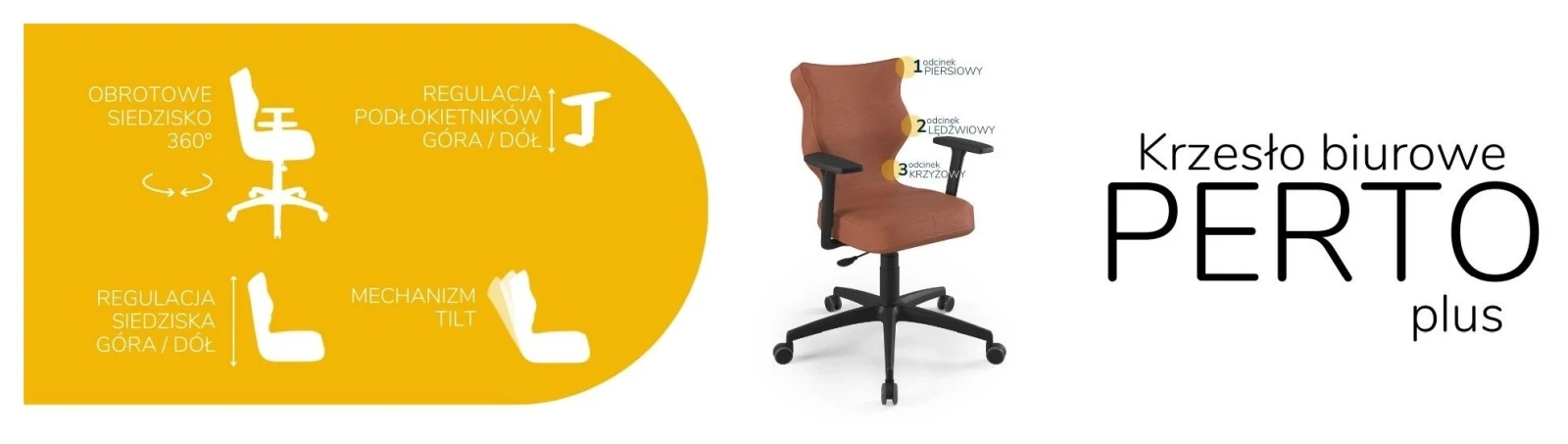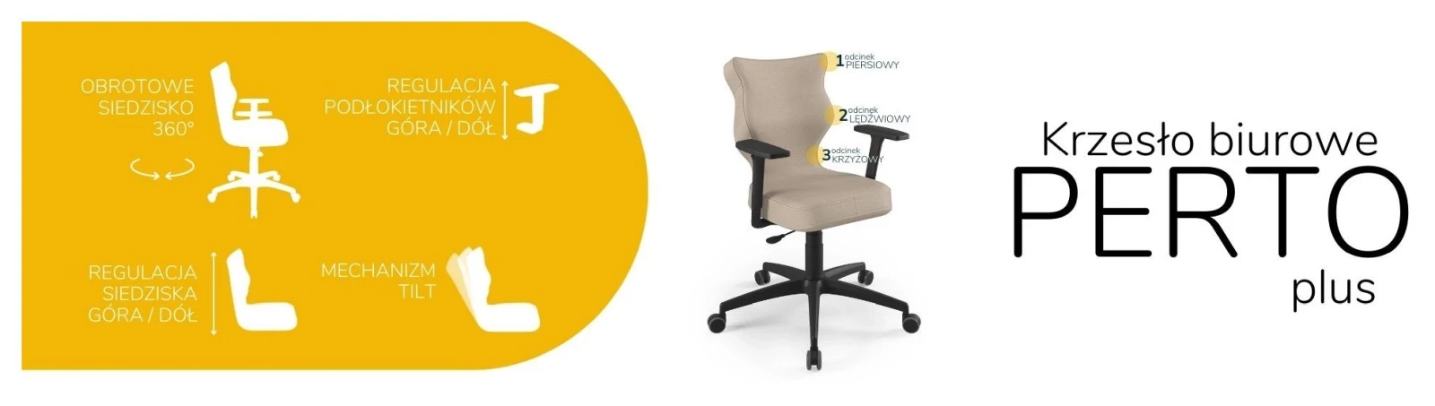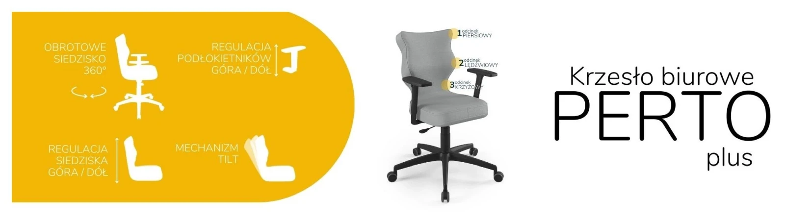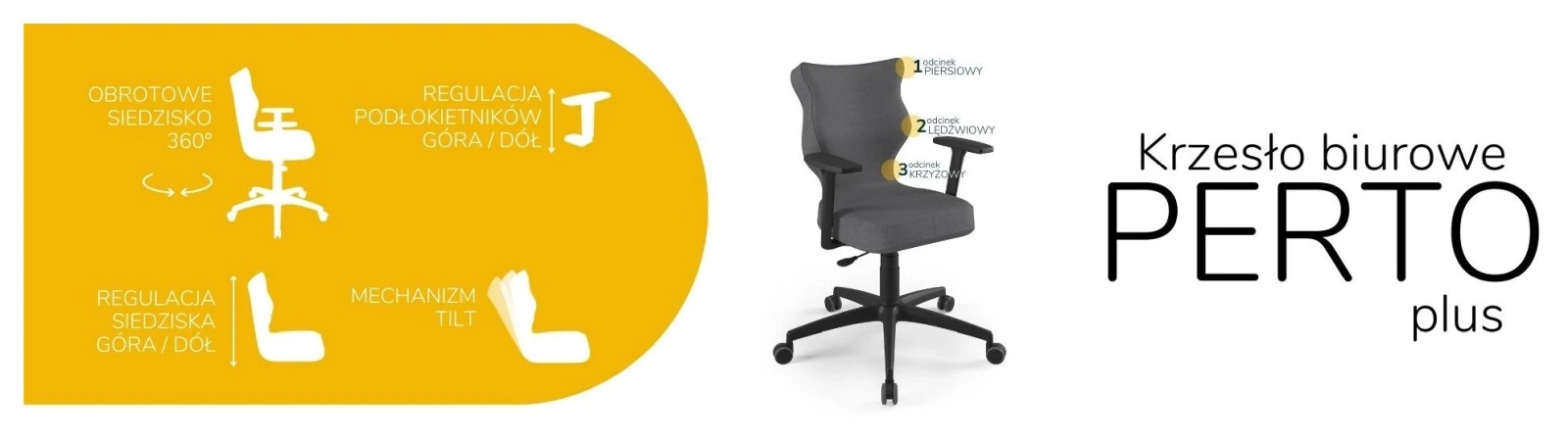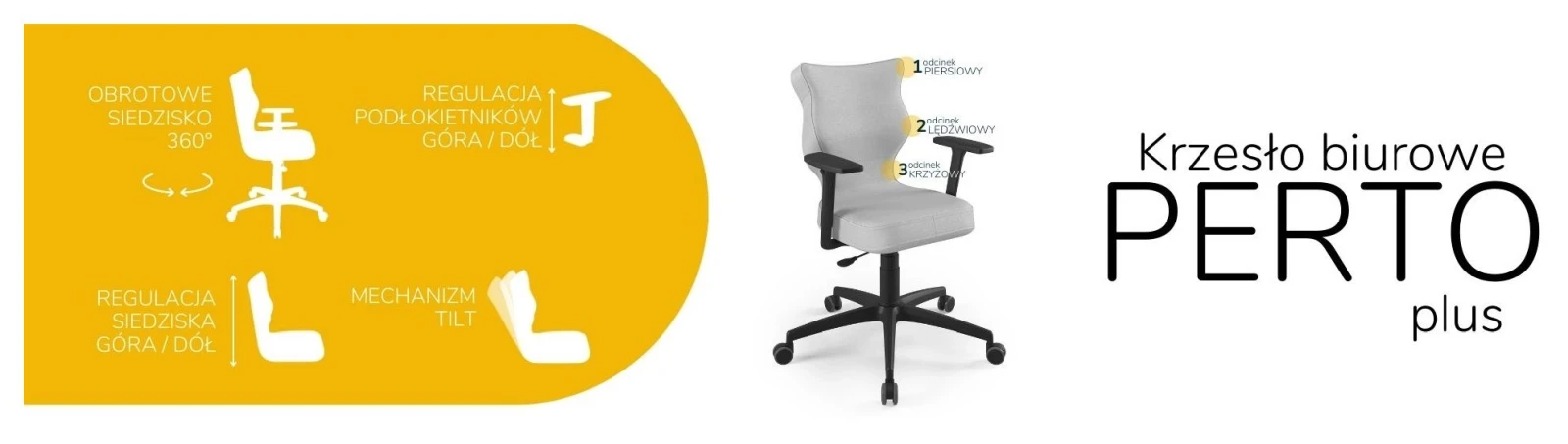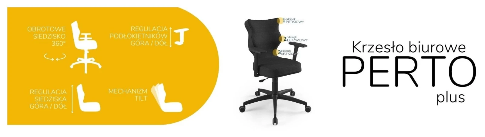 Krzesło obrotowe Perto Plus to nowoczesne i funkcjonalne rozwiązanie dla osób, które spędzają wiele godzin przy biurku. Wyposażone w solidną, czarną podstawę, łączy elegancję z wysoką trwałością. Ergonomicznie zaprojektowane siedzisko i oparcie zapewniają optymalne wsparcie dla kręgosłupa, a możliwość regulacji wysokości siedziska i podłokietników pozwala na dostosowanie krzesła do indywidualnych preferencji. Model dedykowany jest osobom o wzroście od 159 do 188 cm, gwarantując wygodę i wsparcie podczas pracy lub nauki.