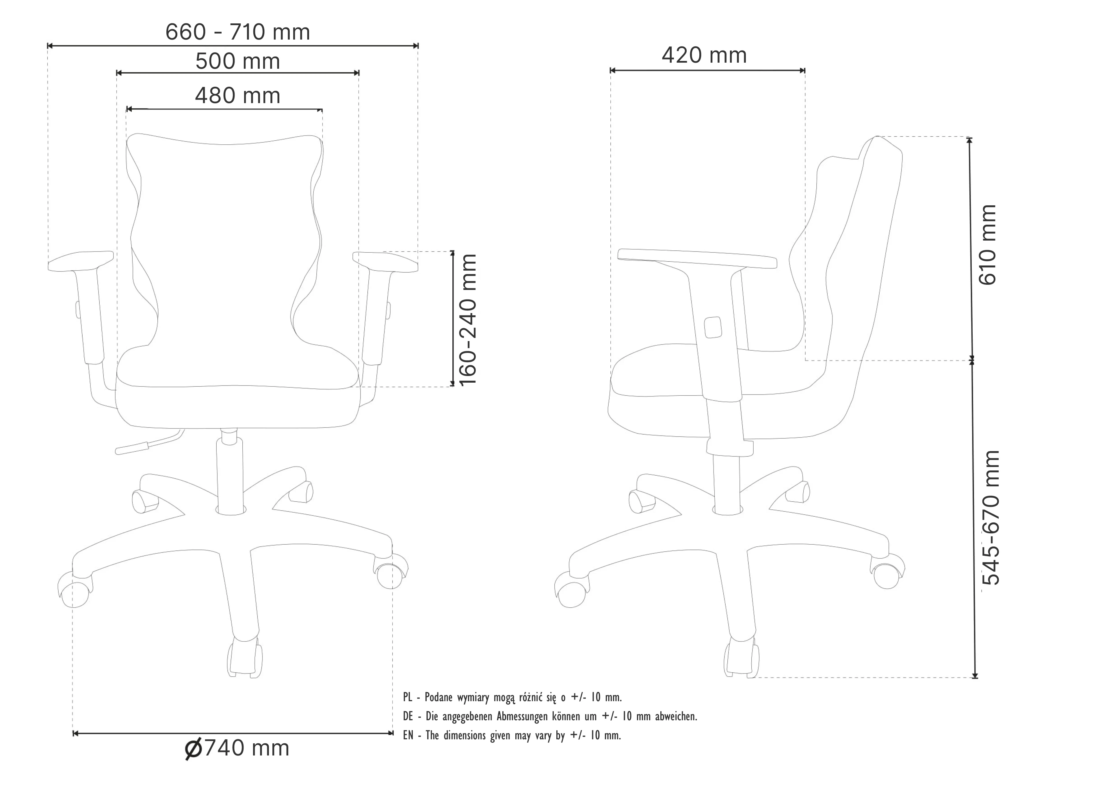 - Zakres regulacji podłokietników: 16 - 24 cm