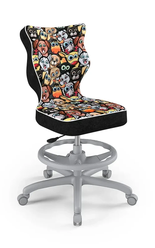 Krzesło dziecięce Petit z podnóżkiem to młodzieżowa propozycja krzesła tak do pokoju dziecięcego jak i pracowni szkolnych, wyposażona we wzorzystą tapicerkę odpowiednią dla młodszych dzieci oraz obrotową podstawę. Komfortowe i ergonomiczne siedzisko tapicerowane jest wytrzymałą tkaniną i dzięki gazowemu podnośnikowi pozwala płynnie ustawić odpowiednią dla dziecka pozycję przed biurkiem. Profilowane oparcie jest miękkie, ale jednocześnie wymusza odpowiednią pozycję pleców, dzięki czemu pozwala zmniejszyć ryzyko powstawania wad postawy. Podstawa jezdna wykonana z wzmocnionego włóknem szklanym tworzywa posiada miękkie kółka pozwalające użytkować krzesło tak na miękkich dywanach, jak twardych parkietach.