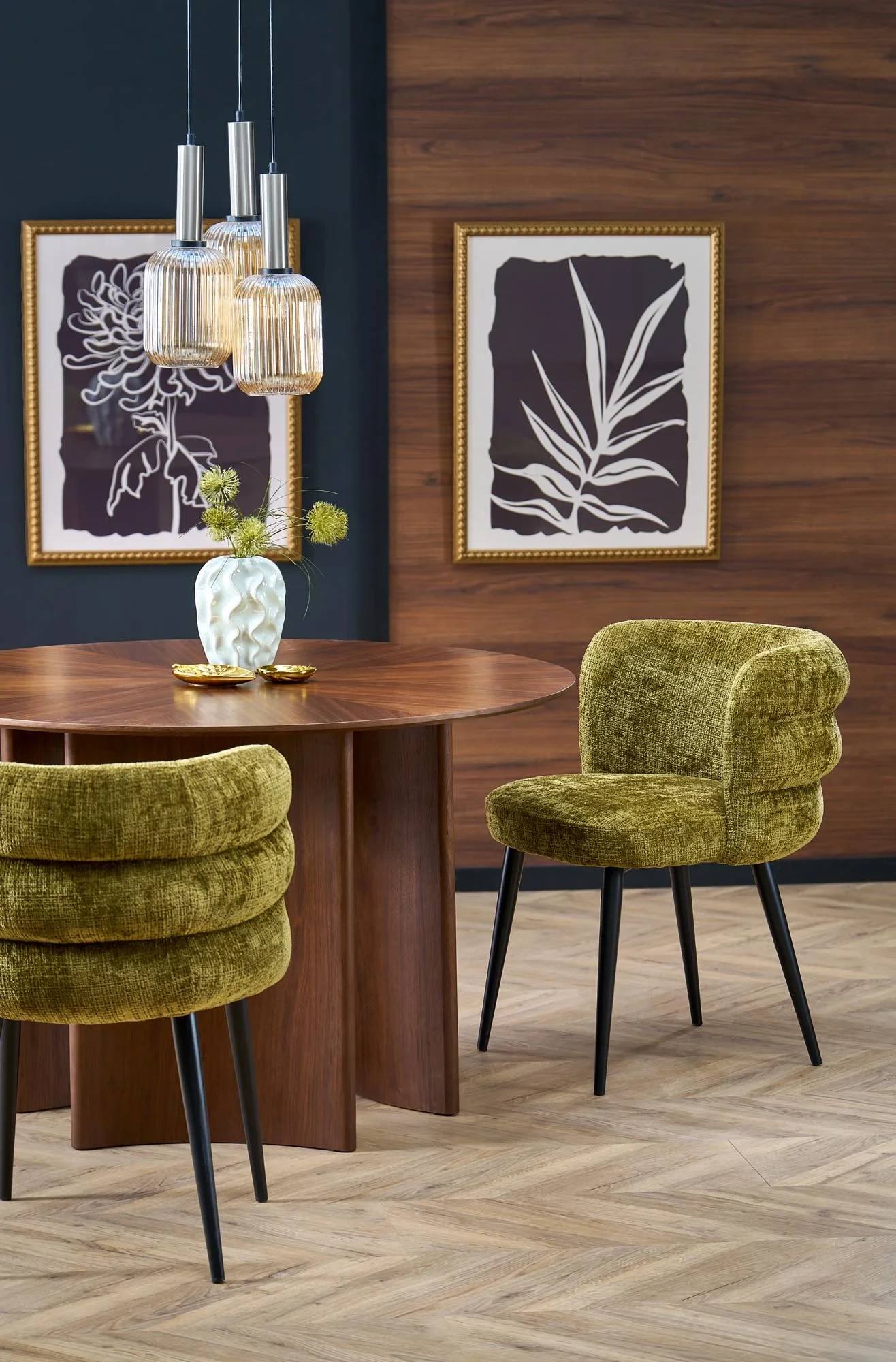 Krzesło K575 w eleganckim oliwkowym kolorze to połączenie nowoczesnej formy z ponadczasową klasyką. Tapicerowane przyjemną w dotyku tkaniną CREMONA, doskonale sprawdzi się w jadalni, salonie lub stylowej przestrzeni komercyjnej, wprowadzając do wnętrza ciepły, naturalny akcent.