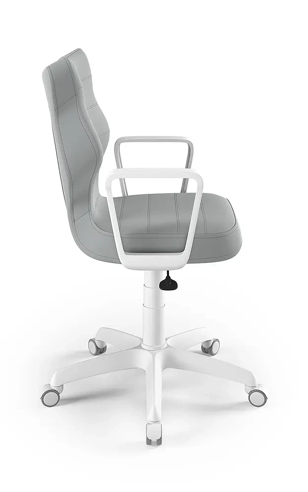 Krzesło Norm to młodzieżowa propozycja krzesła tak do pokoju młodszych i starszych dzieci jak i pracowni szkolnych, wyposażona w tapicerkę w popularnych kolorach odpowiednią dla dzieci i młodzieży oraz obrotową podstawę i stabilne podłokietniki. Komfortowe i ergonomiczne siedzisko tapicerowane jest wytrzymałą tkaniną i dzięki gazowemu podnośnikowi pozwala płynnie ustawić odpowiednią dla dziecka pozycję przed biurkiem. Profilowane oparcie jest miękkie, ale jednocześnie wymusza odpowiednią pozycję pleców, dzięki czemu pozwala zmniejszyć ryzyko powstawania wad postawy. Podstawa jezdna wykonana z wzmocnionego włóknem szklanym tworzywa posiada miękkie kółka pozwalające użytkować krzesło tak na miękkich dywanach, jak twardych parkietach.