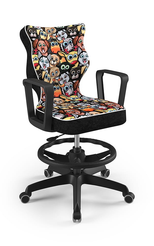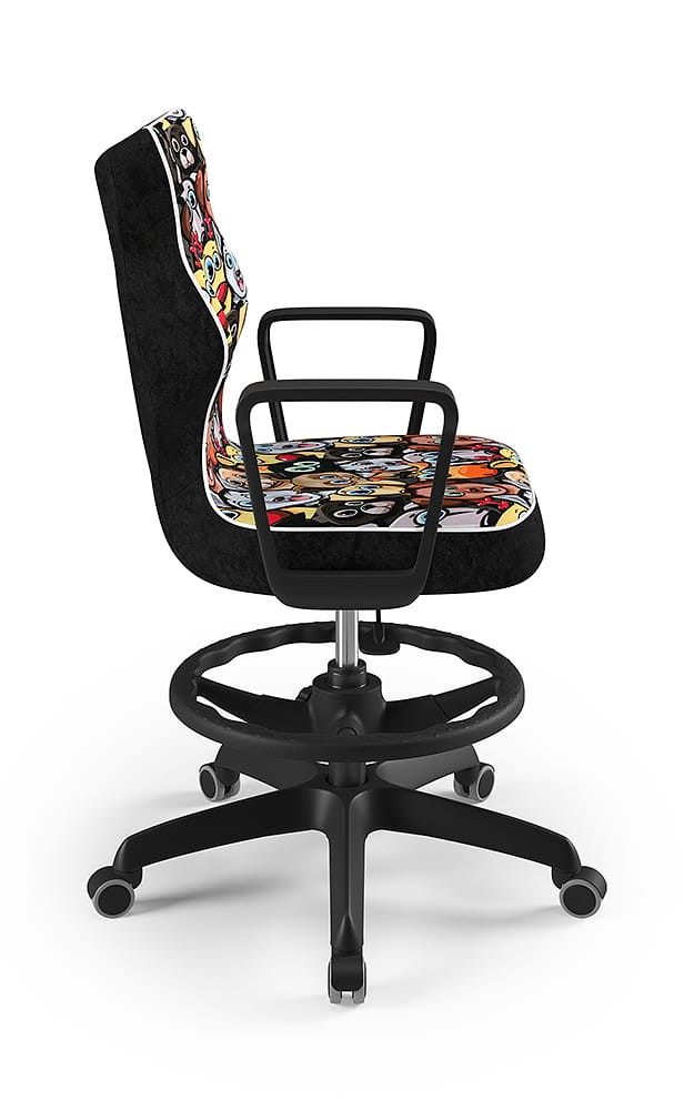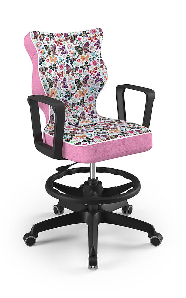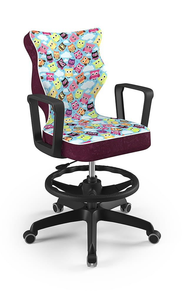 Krzesło Norm z podnóżkiem to młodzieżowa propozycja krzesła tak do pokoju młodszych i starszych dzieci jak i pracowni szkolnych, wyposażona w tapicerkę w popularnych kolorach odpowiednią dla dzieci i młodzieży oraz obrotową podstawę i stabilne podłokietniki. Komfortowe i ergonomiczne siedzisko tapicerowane jest wytrzymałą tkaniną i dzięki gazowemu podnośnikowi pozwala płynnie ustawić odpowiednią dla dziecka pozycję przed biurkiem. Profilowane oparcie jest miękkie, ale jednocześnie wymusza odpowiednią pozycję pleców, dzięki czemu pozwala zmniejszyć ryzyko powstawania wad postawy. Podstawa jezdna wykonana z wzmocnionego włóknem szklanym tworzywa posiada miękkie kółka pozwalające użytkować krzesło tak na miękkich dywanach, jak twardych parkietach.