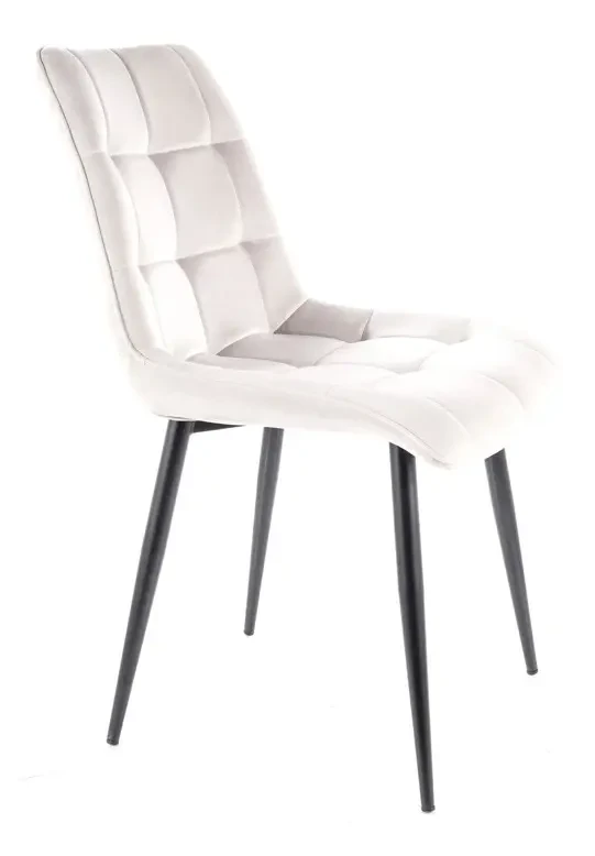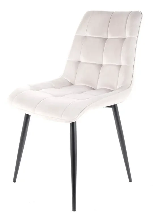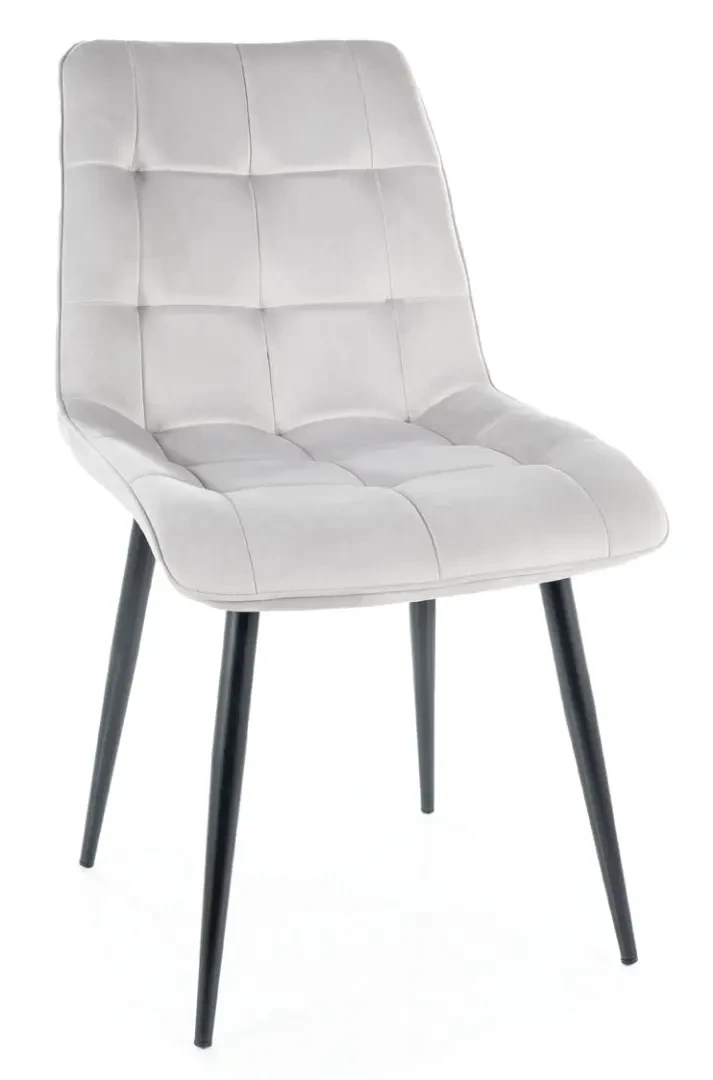 Krzesło Chic Velvet to oryginalna i stylowa propozycja tapicerowanego krzesła, które zapewni nam wyjątkowy komfort siedzenia. Mebel wykonany został wyłącznie z materiałów wysokiej jakości. Siedzisko tapicerowane jest wytrzymałą i niezwykle miękką w dotyku tkaniną aksamitną Bluvel 03 w delikatnym jasnoszarym kolorze. Krzesło posiada ozdobne pikowania, które dodają mu elegancji i stylu. Całość spoczywa na solidnych, metalowych nóżkach wybarwionych w eleganckim kolorze czarnego matu. Krzesło Chic Velvet pięknie ozdobi wnętrze jadalni, czy też kuchni. Jest to niezwykle oryginalny mebel, który z racji swojego klasycznego wyglądu będzie pasować do większości wnętrz. Każdy element krzesła Chic Velvet został doskonale dopracowany.