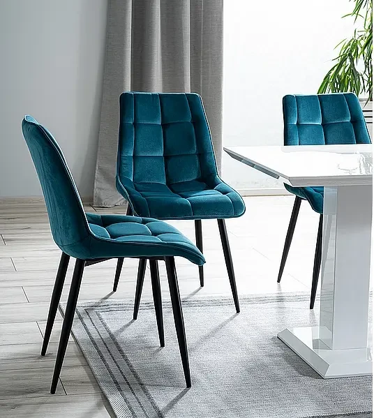 Krzesło Chic Velvet to oryginalna i stylowa propozycja tapicerowanego krzesła, które zapewni nam wyjątkowy komfort siedzenia. Mebel wykonany został wyłącznie z materiałów wysokiej jakości. Siedzisko tapicerowane jest wytrzymałą i niezwykle miękką w dotyku tkaniną aksamitną Bluvel 85 w pięknym turkusowym kolorze. Krzesło posiada ozdobne pikowania, które dodają mu elegancji i stylu. Całość spoczywa na solidnych, metalowych nóżkach wybarwionych w eleganckim kolorze czarnego matu. Krzesło Chic Velvet pięknie ozdobi wnętrze jadalni, czy też kuchni. Jest to niezwykle oryginalny mebel, który z racji swojego klasycznego wyglądu będzie pasować do większości wnętrz. Każdy element krzesła Chic Velvet został doskonale dopracowany.