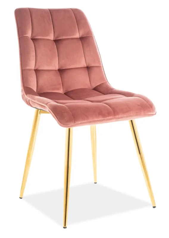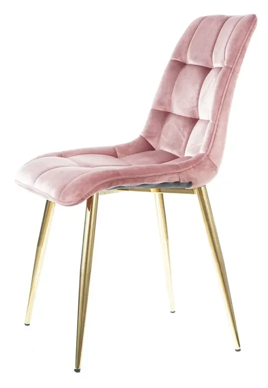 Krzesło Chic Złoty Velvet to oryginalna i stylowa propozycja tapicerowanego krzesła, które zapewni nam wyjątkowy komfort siedzenia. Mebel wykonany został wyłącznie z materiałów wysokiej jakości. Siedzisko tapicerowane jest wytrzymałą i niezwykle miękką w dotyku tkaniną aksamitną Bluvel 52 w delikatnym kolorze antycznego różu. Krzesło posiada ozdobne pikowania, które dodają mu elegancji i stylu. Całość spoczywa na solidnych, metalowych nóżkach wybarwionych w niesamowicie eleganckim, złotym kolorze. Krzesło Chic Złoty Velvet pięknie ozdobi wnętrze jadalni, czy też kuchni. Jest to niezwykle oryginalny mebel, który z racji swojego klasycznego wyglądu będzie pasować do większości wnętrz. Każdy element krzesła Chic Złoty Velvet został doskonale dopracowany.