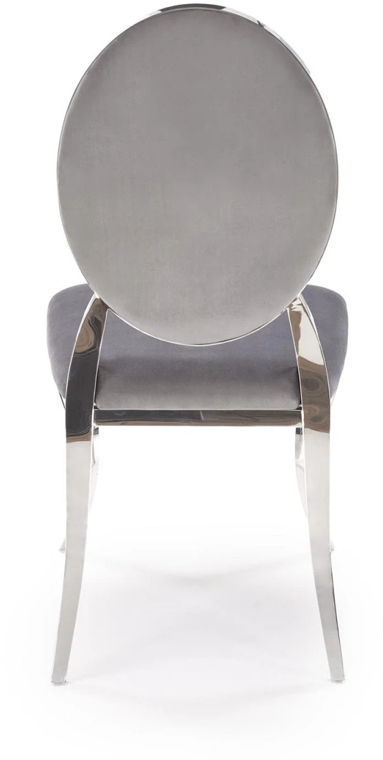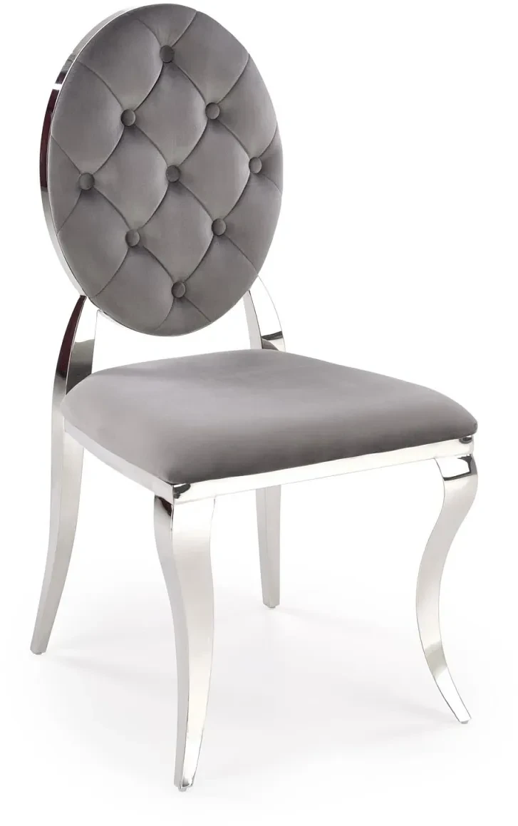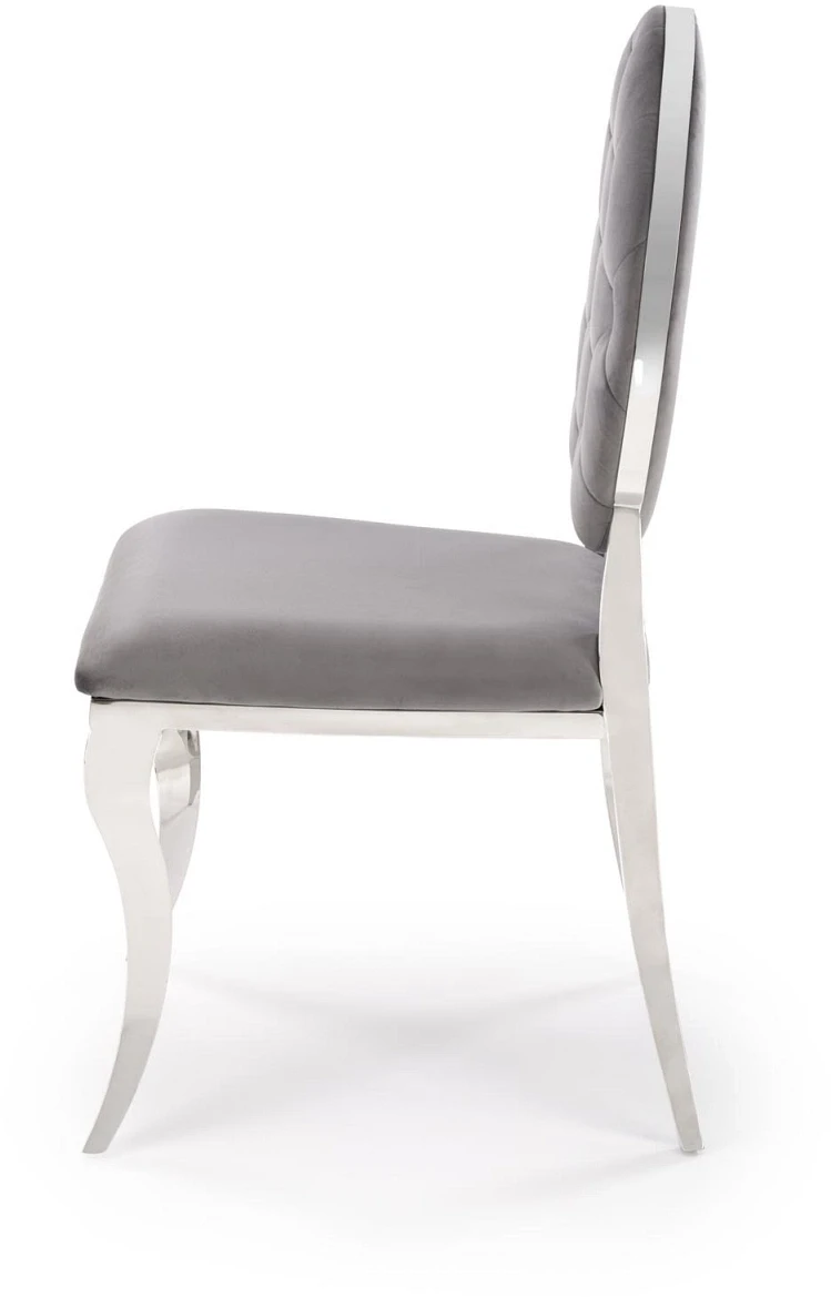Krzesło K555 w kolorze popielatym ze srebrnym stelażem to propozycja dla osób ceniących niebanalne wzornictwo, luksusowy wygląd i wysoki komfort użytkowania. Tapicerka z aksamitnej tkaniny velvet BLUVEL zachwyca subtelnym połyskiem oraz miękkością w dotyku, dzięki czemu każde spotkanie przy stole staje się przyjemnością. Pikowane oparcie w kształcie owalu przyciąga wzrok klasycznym wzorem typu Chesterfield, a wyprofilowane nogi ze stali nierdzewnej w kolorze srebrnym dodają całej konstrukcji wyjątkowej lekkości i nowoczesnej elegancji. To idealny wybór do wnętrz w stylu glamour, nowojorskim czy modern classic. Krzesło K555 łączy w sobie efektowny wygląd z funkcjonalnością – dzięki wytrzymałej konstrukcji oraz materiałom wysokiej jakości, mebel ten będzie cieszyć użytkowników przez długie lata.