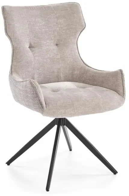 Model wyposażony jest w funkcję obracania 180°, co zwiększa komfort użytkowania i swobodę ruchu. Czarne, metalowe nogi o prostym, prostokątnym przekroju podkreślają nowoczesny charakter mebla, a tapicerowane siedzisko zapewnia wygodę podczas codziennego użytkowania.