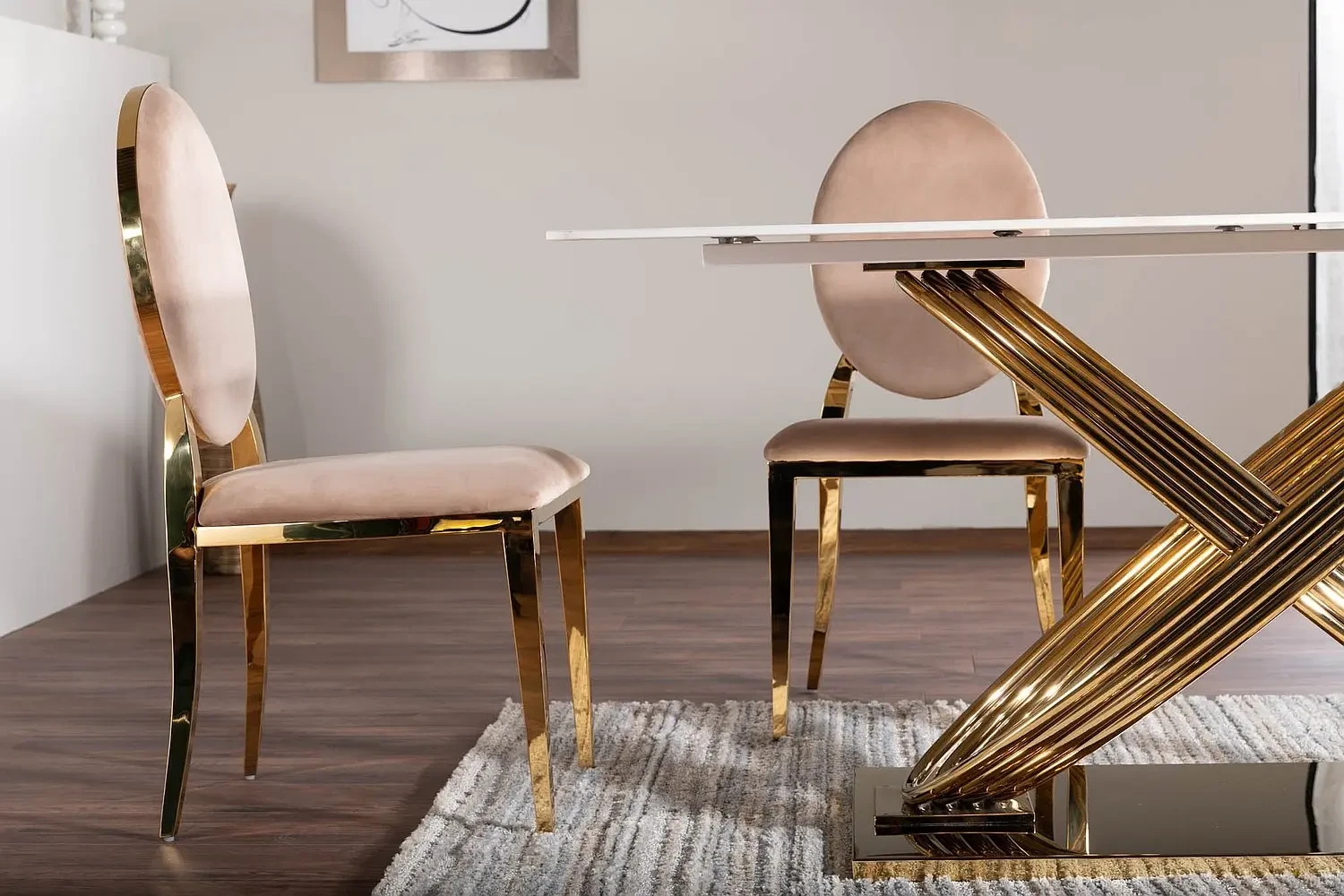 Krzesło King Velvet to elegancki mebel, który wyróżnia się swoim wyrafinowanym designem. Obicie wykonane jest z wysokiej jakości aksamitnej tkaniny Bluvel 28 w subtelnym beżowym kolorze, co nadaje mu luksusowego wyglądu i zapewnia przyjemność użytkowania. Stelaż krzesła wykonany jest ze stali nierdzewnej, co gwarantuje jego trwałość i stabilność, a złoty kolor dodaje elegancji i podnosi estetyczny wymiar każdego pomieszczenia, w którym się znajdzie. Krzesło King Velvet łączy w sobie klasyczną elegancję z nowoczesnym designem, idealnie komponując się w różnorodnych aranżacjach wnętrz.