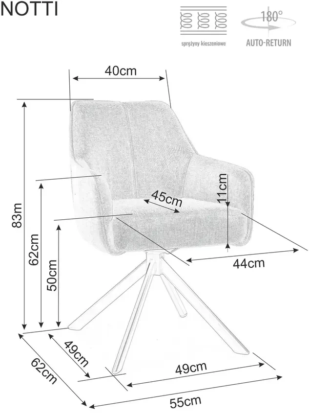 - Siedzisko obracane w zakresie 180 stopni z funkcją powrotu do pierwotnej pozycji