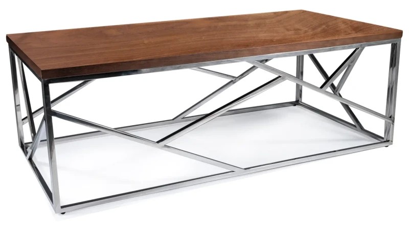 Ława Escada A to elegancka i oryginalna propozycja nowoczesnego mebla do salonu. Blat wykonany został z wysokiej jakości płyty MDF pokrytej okleiną naturalną w kolorze orzecha. Oryginalny w swojej konstrukcji stelaż ławy Escada A wykonano ze stali nierdzewnej w kolorze srebrnym, gwarantując stabilność i elegancki wygląd całej konstrukcji. Prosty, lecz oryginalny design mebla w stylu glamour sprawia, że ława Escada A świetnie wkomponuje się do wnętrz nowoczesnych, jak również jako przełamanie do pomieszczeń bardziej tradycyjnych.