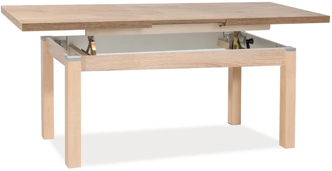 Ławostół Kleopatra to prosta i stylowa propozycja klasycznego, rozkładanego stołu do pokoju dziennego. Dzięki opcji rozsuwania, stół można łatwo złożyć i rozłożyć przygotowując go do przyjęcia większej liczby gości. Ławostół Kleopatra rozkłada się aż do 164 cm, pozwalając zmieścić wygodnie 6 osób. Ponadto mebel posiada funkcję płynnej regulacji podnoszenia blatu, dzięki czemu stół może uzyskać nawet do 75 cm wysokości. Prosty i ponadczasowy design sprawia, że stół świetnie sprawdzi się we wnętrzach tradycyjnych, jak również w tych bardziej współczesnych. Blat ławostołu Kleopatra został wykonany z wysokiej jakości płyty laminowanej w kolorze dąb sonoma. Całość opiera się na podstawie wykonanej z solidnego drewna bukowego, również w kolorze dąb sonoma. Sposób wykonania całej konstrukcji gwarantuje jej stabilność i trwałość.