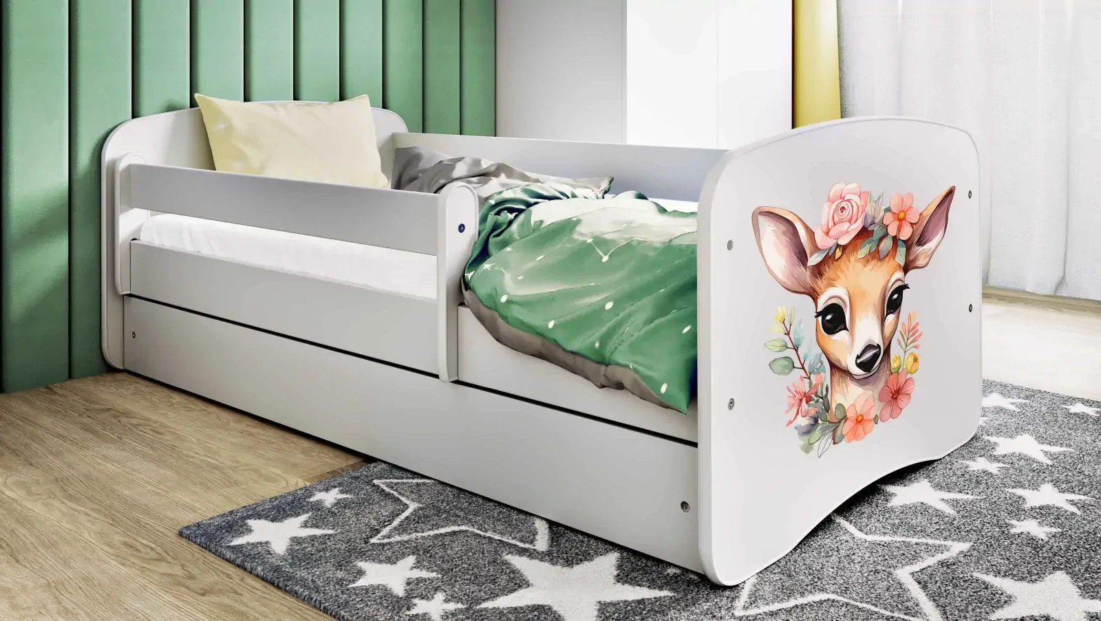 Łóżeczko Babydreams to niezwykła propozycja komfortowego i bezpiecznego łóżka dziecięcego. Korpus łóżeczka wykonany został z wysokiej jakości płyty laminowanej w najgrubszym stosowanym rozmiarze czyli 18 mm, zaś stelaż wykonany jest z naturalnego drewna. Solidna budowa oraz zaokrąglone krawędzie gwarantują trwałość i bezpieczeństwo użytkowania. Fronty łóżka pokryto gumową okleiną mocowaną bez użycia kleju. Łóżeczko posiada ruchomą barierkę o długości 100 cm oraz ma możliwość dokupienia szuflady, która jest dwudzielna (przegroda w środku). Barierka, tak jak i szuflada, mogą zostać zamontowane po obu stronach mebla. Montaż łóżeczka odbywa się przy użyciu specjalnych śrub ściągających, dzięki którym wytrzymuje ono obciążenie do 100 kg. Łóżko Babydreams dostępne jest w kilku kolorach oraz z możliwością wyboru ozdobnej naklejki. Ten element ozdobny z pewnością spodoba się każdemu dziecku, gdyż zawiera postacie z bajek, księżniczki, auta oraz zwierzątka. Poniżej znajduje się paleta naklejek dedykowanych dla dziewczynek. Łóżko posiada certyfikację dlatego jest bezpieczne nawet dla mniejszych dzieci (m.in. nie posiada małych elementów np. jak zaślepki śrub, które dziecko mogłoby zdjąć i połknąć).
