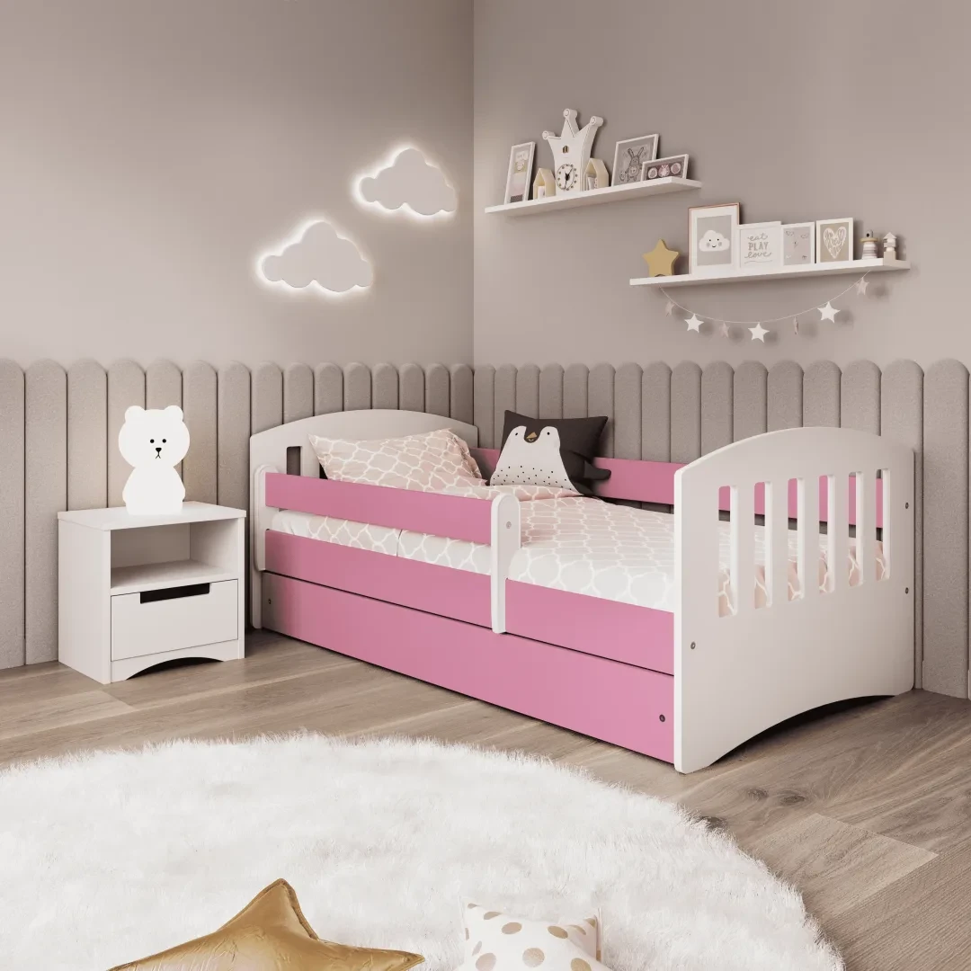 Łóżeczko Classic 1 to klasyczna propozycja komfortowego i bezpiecznego łóżeczka dziecięcego. Korpus łóżeczka wykonany został z wysokiej jakości płyty laminowanej w najgrubszym stosowanym rozmiarze czyli 18mm zaś stelaż wykonany jest z naturalnego drewna sosnowego. Solidna budowa oraz zaokrąglone krawędzie gwarantują trwałość i bezpieczeństwo użytkowania. Wykonane z płyty MDF fronty zostały 3-krotnie polakierowane atestowanymi farbami ekologicznymi na żywe i ułatwiające dopasowanie łóżeczka do pokoju dziecięcego kolory. Łóżeczko ma możliwość dokupienia dwudzielnej szuflady oraz posiada ruchomą barierkę o długości 100 cm. Tak szuflada jak barierka może zostać zamontowana po obu stronach mebla. Łóżko posiada certyfikację dlatego jest bezpieczne nawet dla mniejszych dzieci (m.in. nie posiada małych elementów np. jak zaślepki śrub, które dziecko mogłoby zdjąć i połknąć).